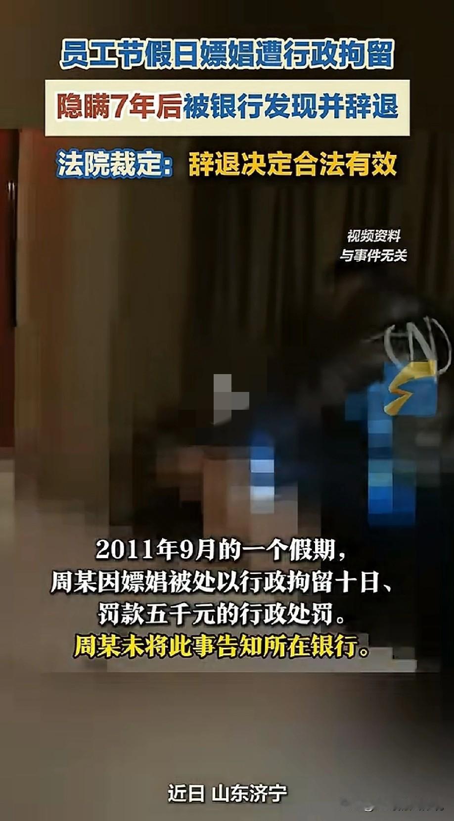 山东济宁,一银行男员工在7年前,单位放假期间,曾因嫖 娼被行政拘留并罚款处理,但