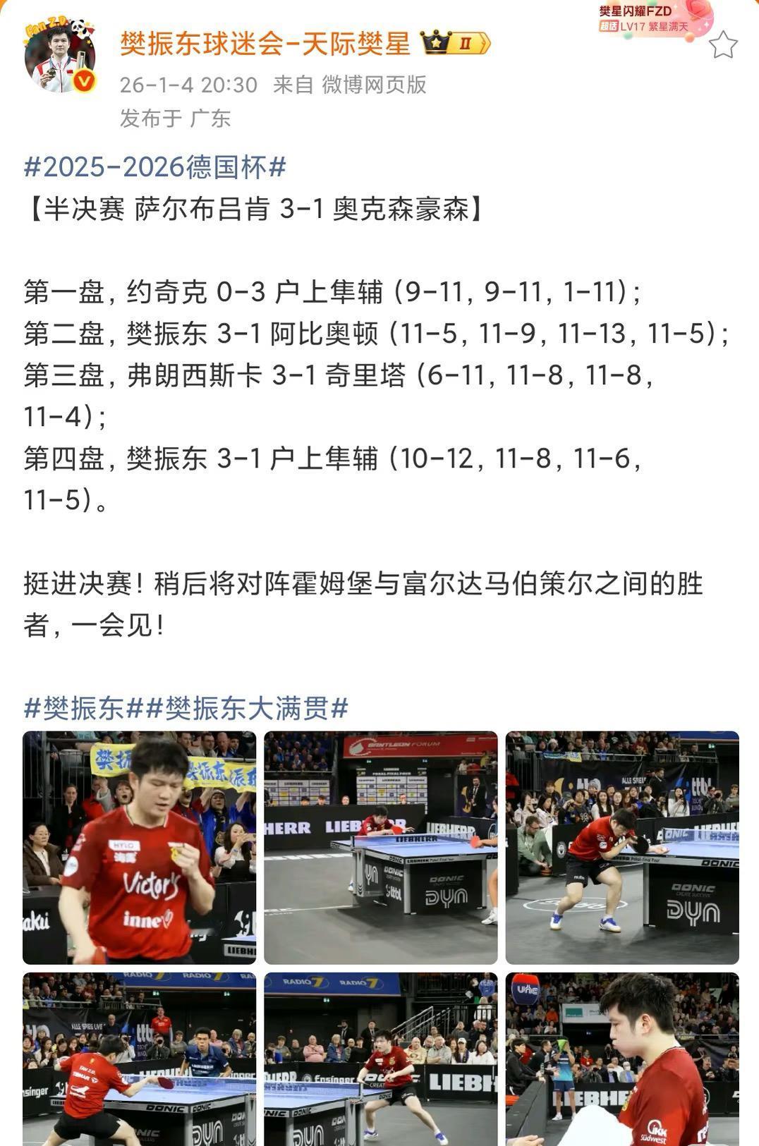 樊振东3:1户上隼辅——方博:户上把樊振东研究明白了也打不过! 要靠研究这一块, 我也大满贯了! 德国杯半决赛, 铁血一单樊振东一人二分助 萨尔布吕肯晋级决赛! 方博在直播间表示: “户上已经把樊振东研究明白了, 户上在前三板控制这一块, 摆短,比我想象的要好, 只能说研究的非常不错👍, 但是比赛靠的是啥? 靠的是打, 如果要靠研究, 就这一块我也大满贯啦!” 纸上谈兵终是浅啊, 打球研究对手是一方面, 赛场上实时变化, 特别是樊振东的现场解题能力, 又够户上回去研究一阵子啦!