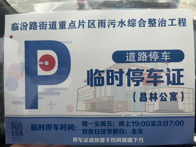 为了解决停车问题,街道和物业推出了“临时停车证”,允许小区业主将车停在周边的景凤路上。记者看到了这张“临时停车证”,抬头印着“临汾^路街道重点片区雨污水综合整治工程”,规定临时停车时间为“周一至周五晚上19:00至次日7:00,双休日及节假日全天”。
