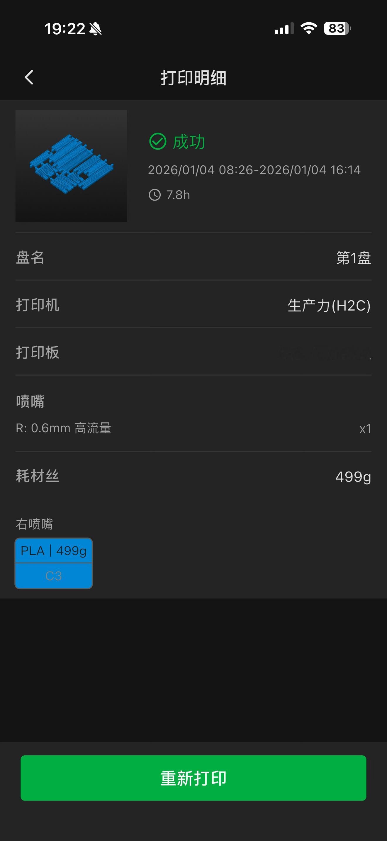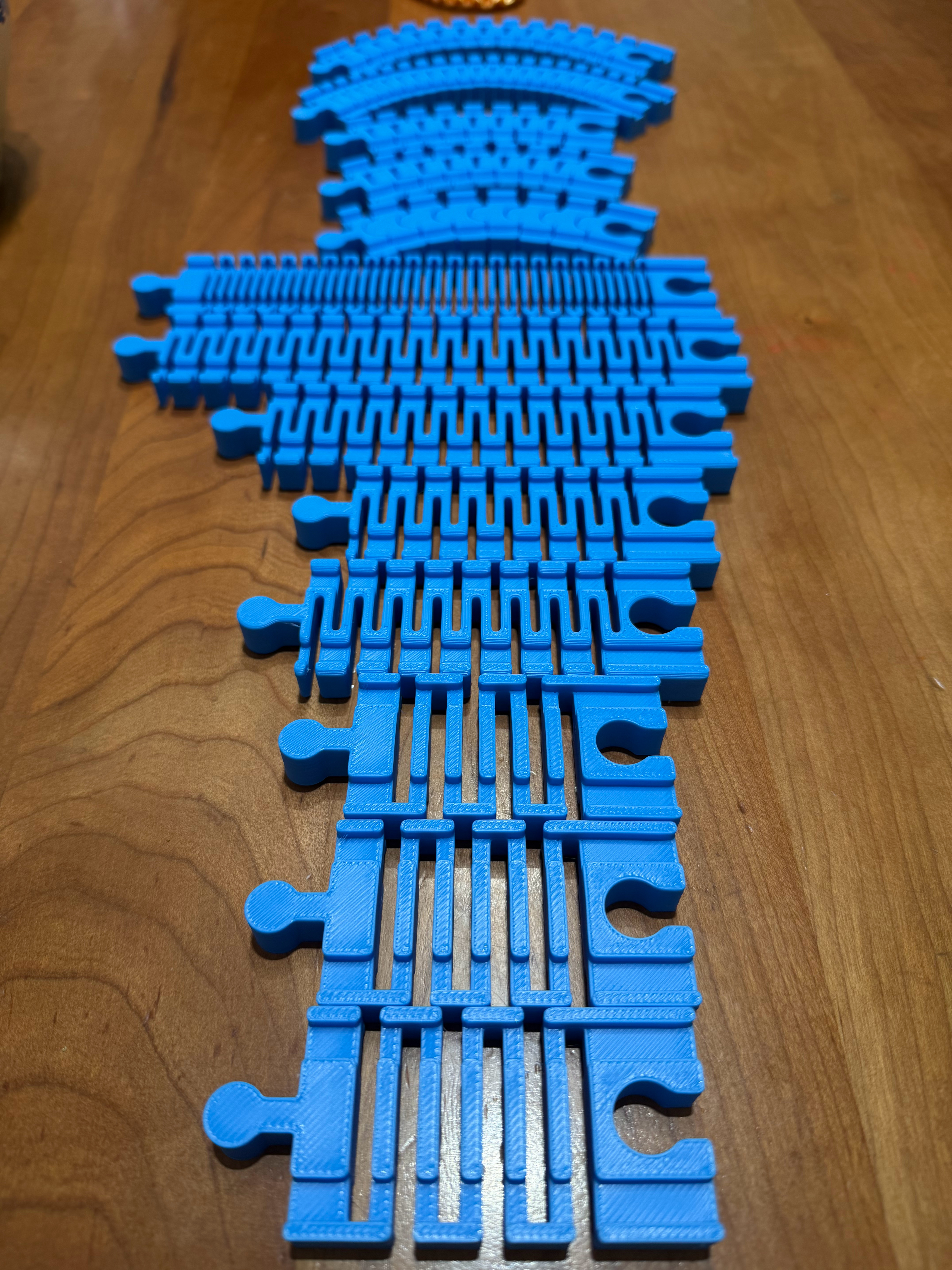 小火车轨道不够用了,主要是弯道,固定曲率的弯道有局限性,短的大曲率的容易转不过弯,长的小曲率的有时候摆不上,所以打了满满一盘各种长度的可变曲率弯道。消耗500g耗材成本10块钱,查了下我之前买的轨道,10块钱能买4条。用0.6mm高流量喷头,开166%的狂暴模式,把原本十几个小时的打印时间缩短到了8个小时,打印质量依然不错的。