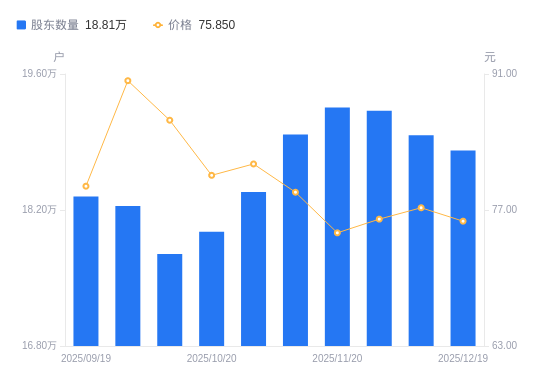 日期A股户数(户)流通A股户均持股数(股)户均持股市值(万元)2025-12-191881304515.3534.252025-12-101897004477.9834.582025-11-281922054419.6233.622025-11-201925404411.9332.942025-11-101897774476.1635.292025-10-311838454620.5937.772025-10-201797644725.4938.072025-10-101774704786.5741.282025-09-301824244656.5842.052025-09-191833964631.6436.80