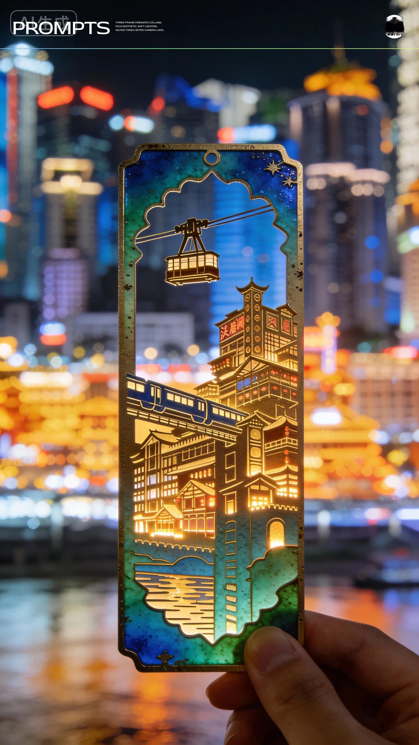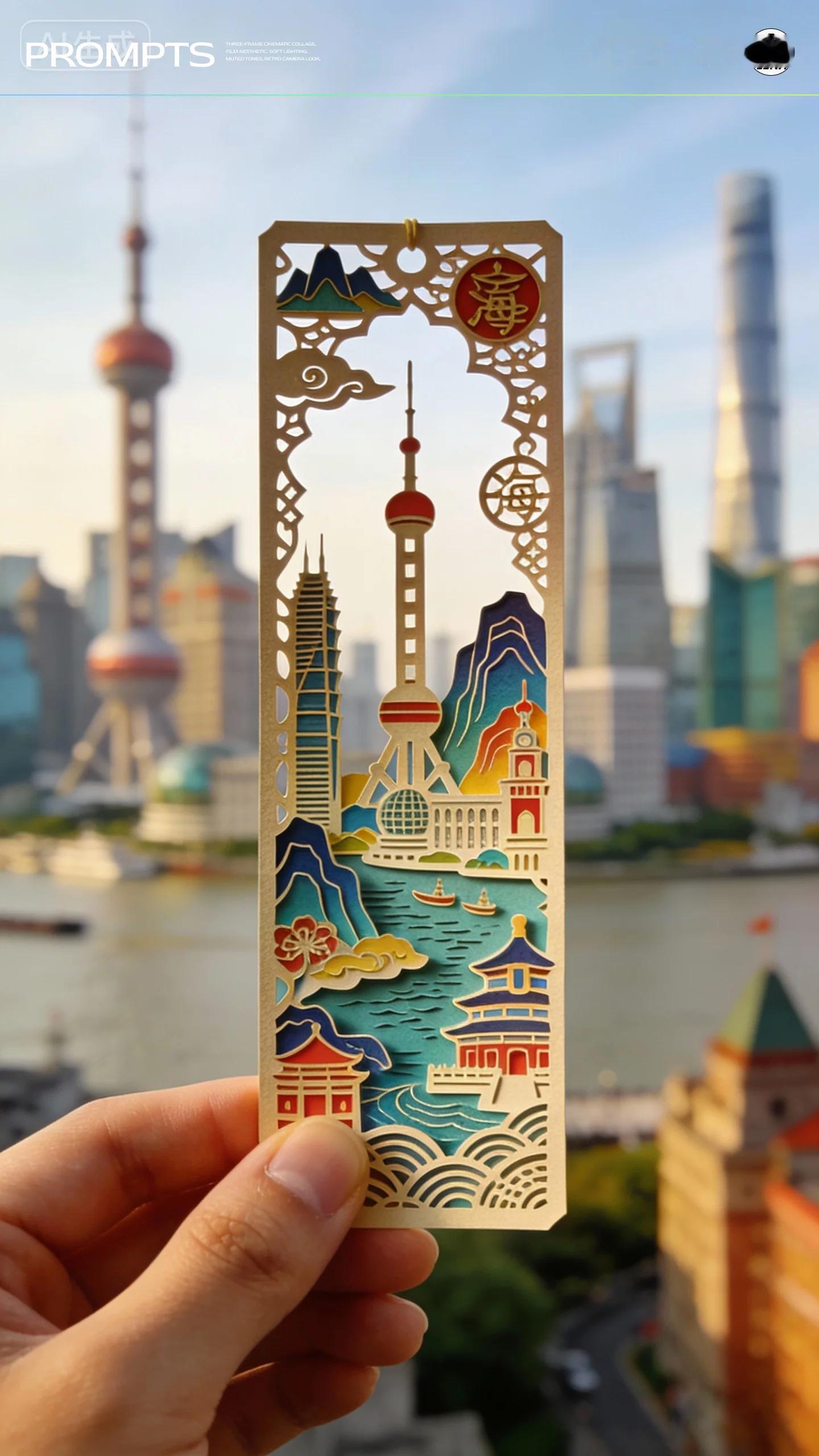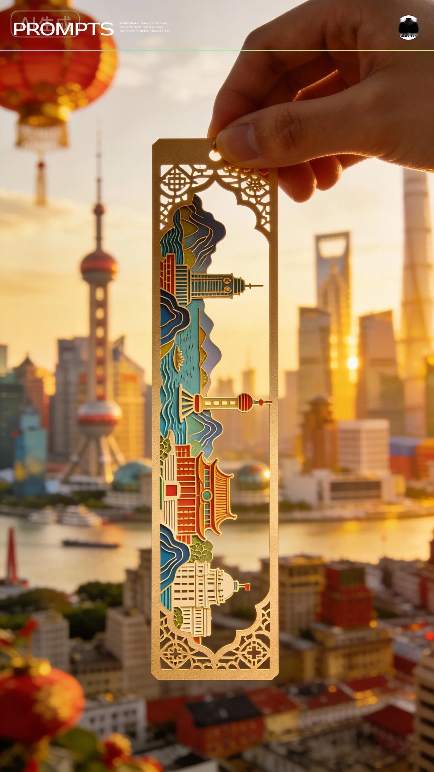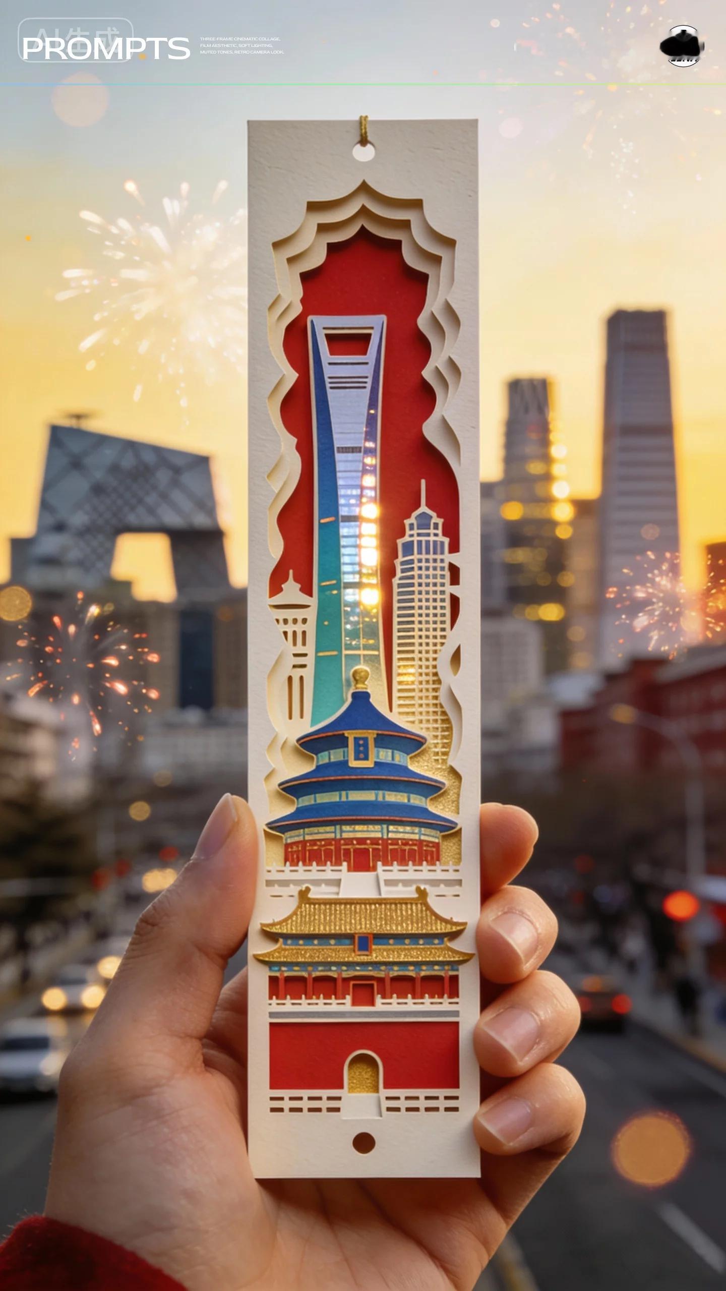 AI一键生成10+城市地标书签!附详细提示词工具:即梦提示词:一只手拿着一个细长的垂直镂空书签。书签的设计采用精致的层叠剪纸插图,具有3D立体感和充满奇思妙想的艺术风格。书签框内描绘[地点]的标志性地标和符号,部分元素略微凸出于边缘(形成镂空效果)。整体艺术元素包含细腻的纹理、鲜艳的色彩和微缩的建筑细节。背景是[地点]实际天际线和风景的浪漫电影式广角镜头。采用柔和的散景,背景虚化以突出作为焦点的书签。构图是手和书签的特写,垂直居中。整体氛围是怀旧、唯美、充满旅行灵感和诗意。调色盘上,书签的图案色彩与真实背景色彩和谐融合。ai创造营