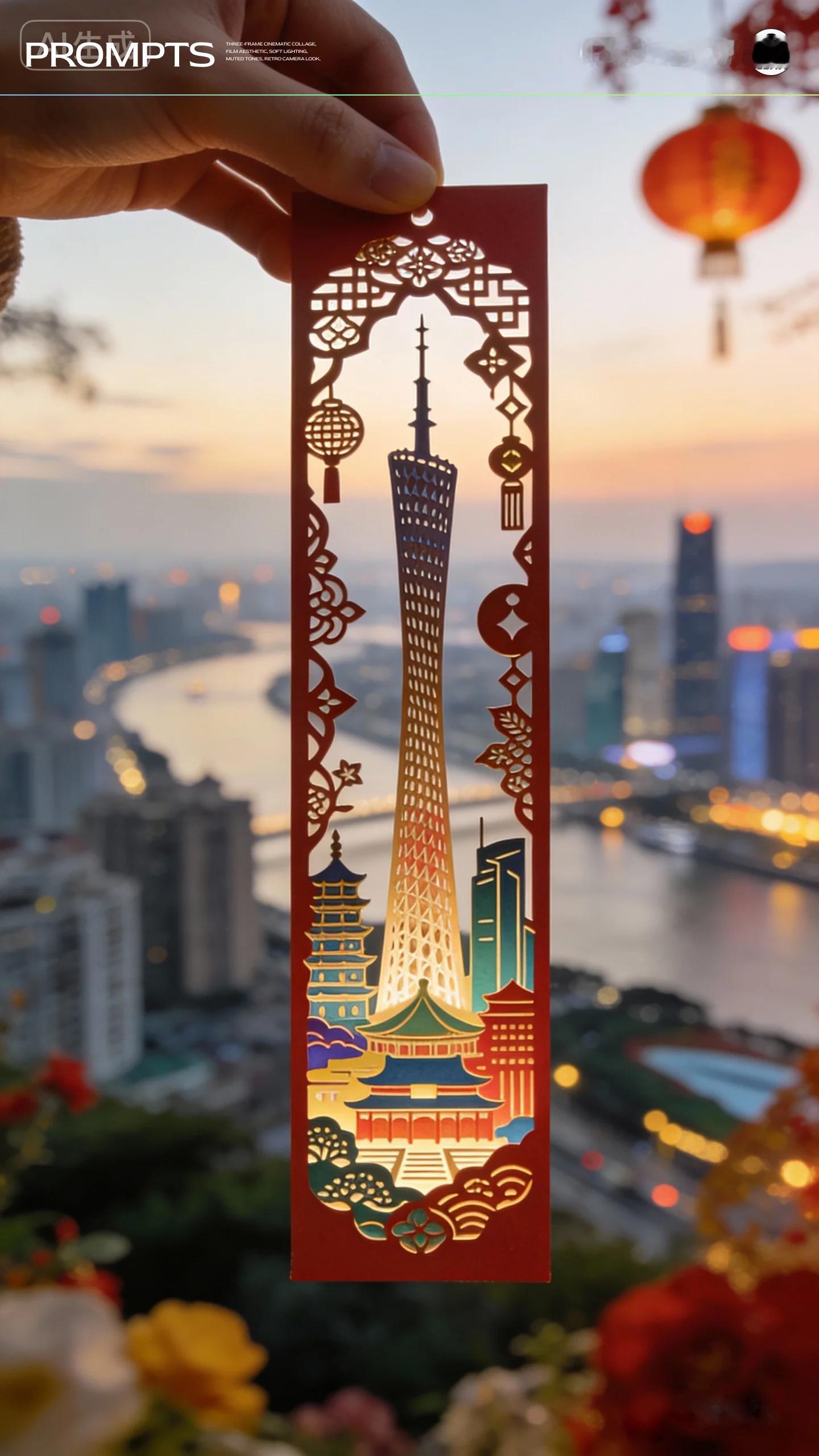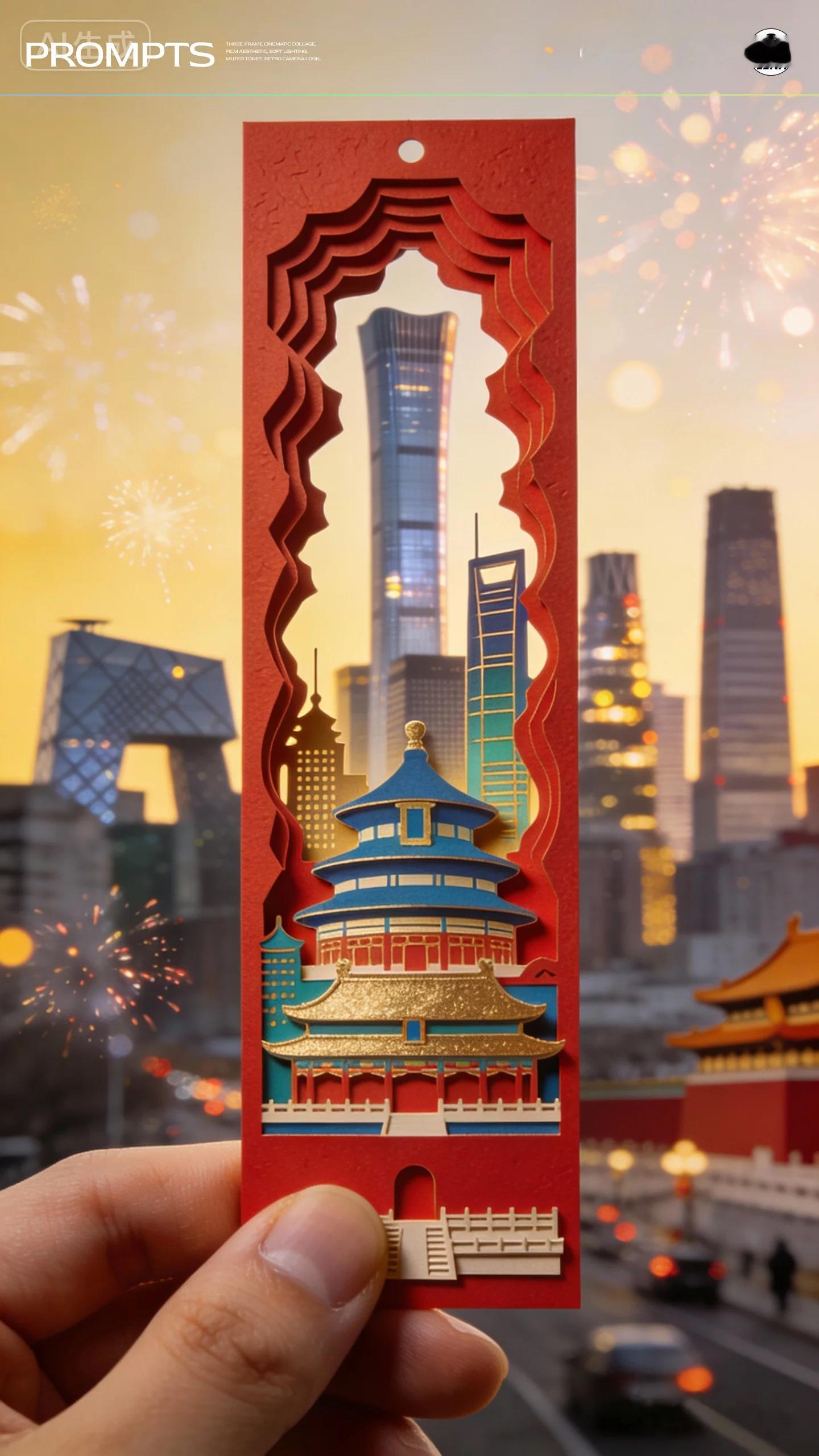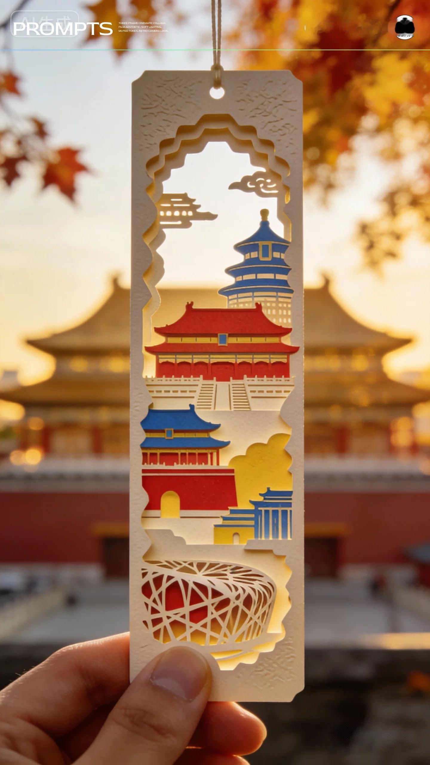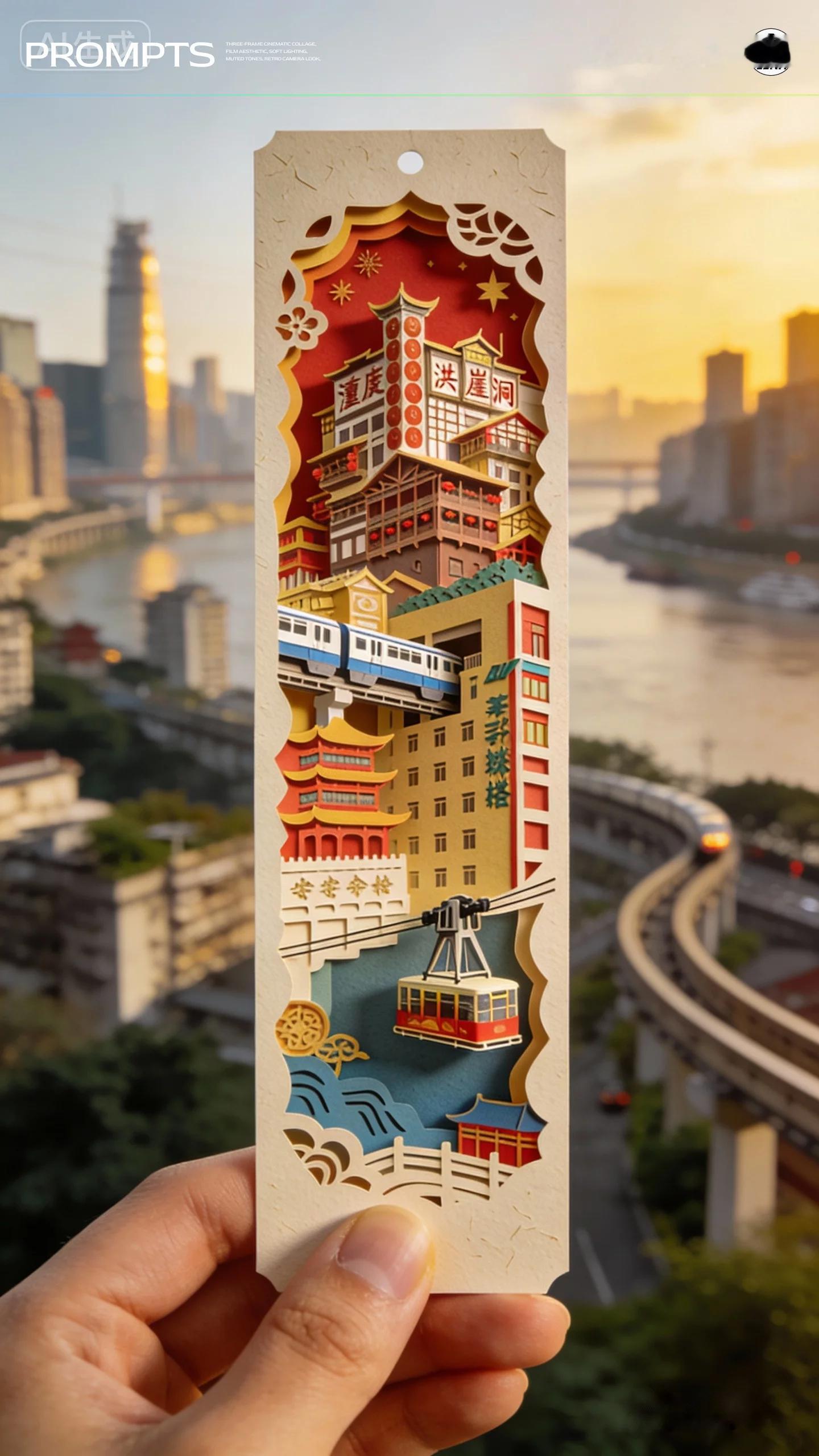 AI一键生成10+城市地标书签!附详细提示词工具:即梦提示词:一只手拿着一个细长的垂直镂空书签。书签的设计采用精致的层叠剪纸插图,具有3D立体感和充满奇思妙想的艺术风格。书签框内描绘[地点]的标志性地标和符号,部分元素略微凸出于边缘(形成镂空效果)。整体艺术元素包含细腻的纹理、鲜艳的色彩和微缩的建筑细节。背景是[地点]实际天际线和风景的浪漫电影式广角镜头。采用柔和的散景,背景虚化以突出作为焦点的书签。构图是手和书签的特写,垂直居中。整体氛围是怀旧、唯美、充满旅行灵感和诗意。调色盘上,书签的图案色彩与真实背景色彩和谐融合。ai创造营