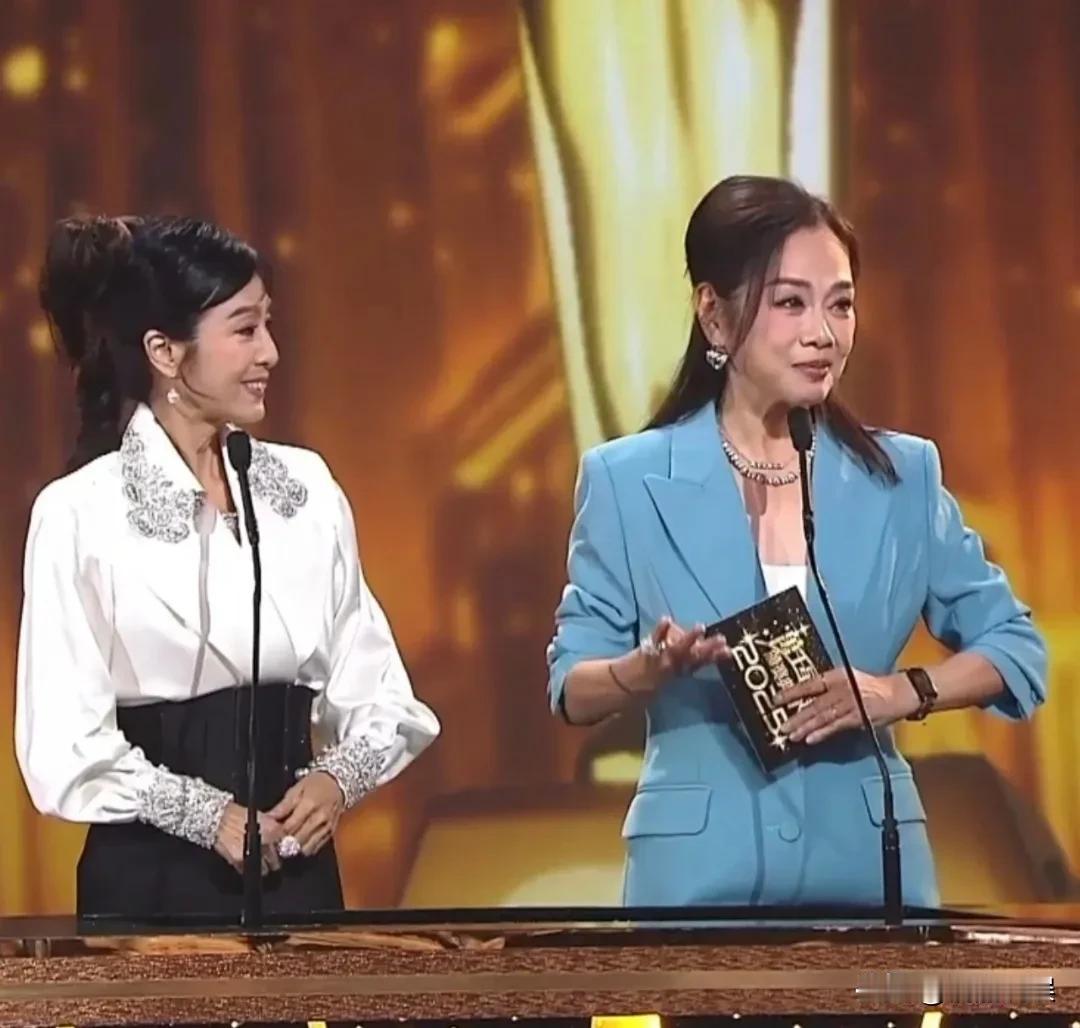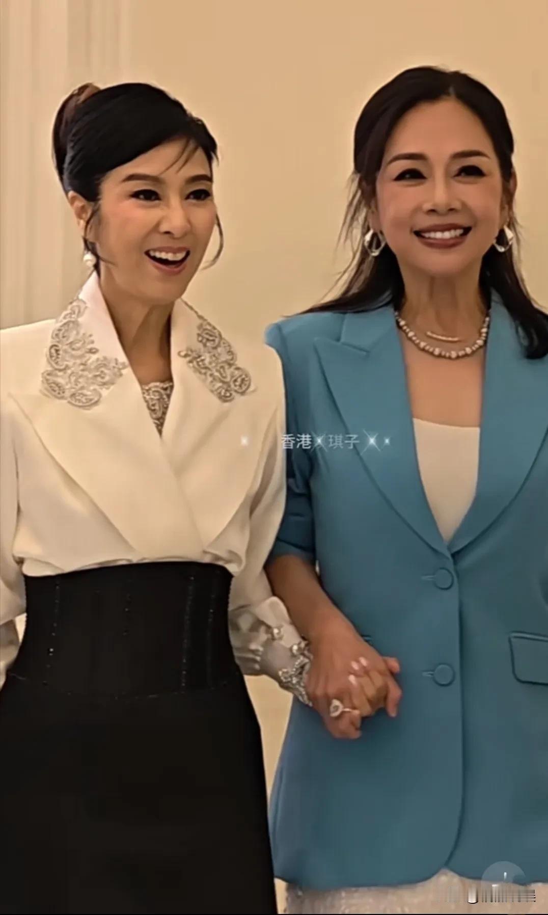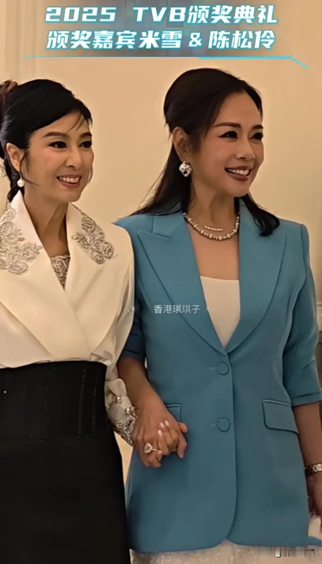 难得一见啊! TVB七、八十年代和九十年代的当红花旦同框了。 七十岁的米雪和54岁的陈松伶,作为颁奖嘉宾,参加TVB的颁奖典礼。 米雪发量好多,扎着高马尾,一身黑白拼色长裙,脸很小也很紧致,身材清瘦。 陈松伶穿着一条白色裙子外搭蓝色外套,身材胖瘦得宜,气质优雅。 俩人年轻时都是大美人,有颜值有演技有作品,都是很出色的演员。 但是实话实说,我就觉得米雪好像没老过,感觉她的状态真不输一旁小了十几岁的陈松伶。[捂脸]