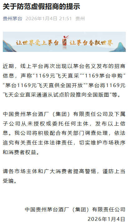 1月4日,中国贵州茅台酒厂(集团)有限责任公司发布《关于防范虚假招商的提示》: