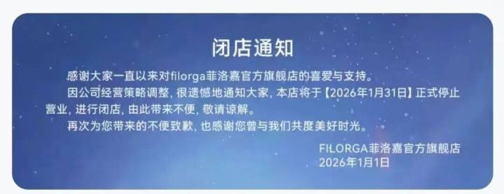 近日,法国院线护肤品牌Filorga菲洛嘉官方旗舰店发布公告称,由于公司经营策略调整,店铺将于2026年1月31日正式停止运营并闭店。目前,该店铺拥有303万粉丝,明星单品“十全大补面膜”已累计售出超3万件。