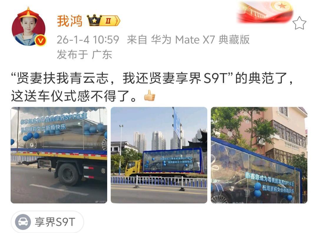广西的鸿蒙智行车主好浪漫啊,新婚赠豪车,再来个定制化巡游,满城都知道他们结婚了,而且以后夫妻俩都可以去鸿蒙大饭店吃饭喝咖啡了,难怪连余承东团队成员、博主“我鸿”都忍不住发微博点赞他们,称他们这次提享界S9T是“贤妻扶我青云志,我还贤妻享界S9T”。 看得出来,广西南宁的这家鸿蒙智行用户中心策划的这场交付场景,给新婚车主夫妻俩的情绪价值拉满了,也让享界S9T的“旅行车”定位有了更鲜活的画面——这不只是一辆车,更是夫妻俩未来一起奔赴山海的陪伴,而鸿蒙生态的配套服务,又让这份浪漫从出行延伸到了日常的衣食住行。 从定制化的卡车交付、专属的祝福语就能看出来,鸿蒙智行不是只卖车的品牌,而是愿意为用户的重要时刻见证和添彩,这种和用户共情的细节,也太有温度了,难怪越来越多的人愿意选择华为系的车型。华为入局智驾的鲶鱼效应 鸿蒙智行 享界s9t 享界s9旅行版 享界s9分享会 享界s9旅行款