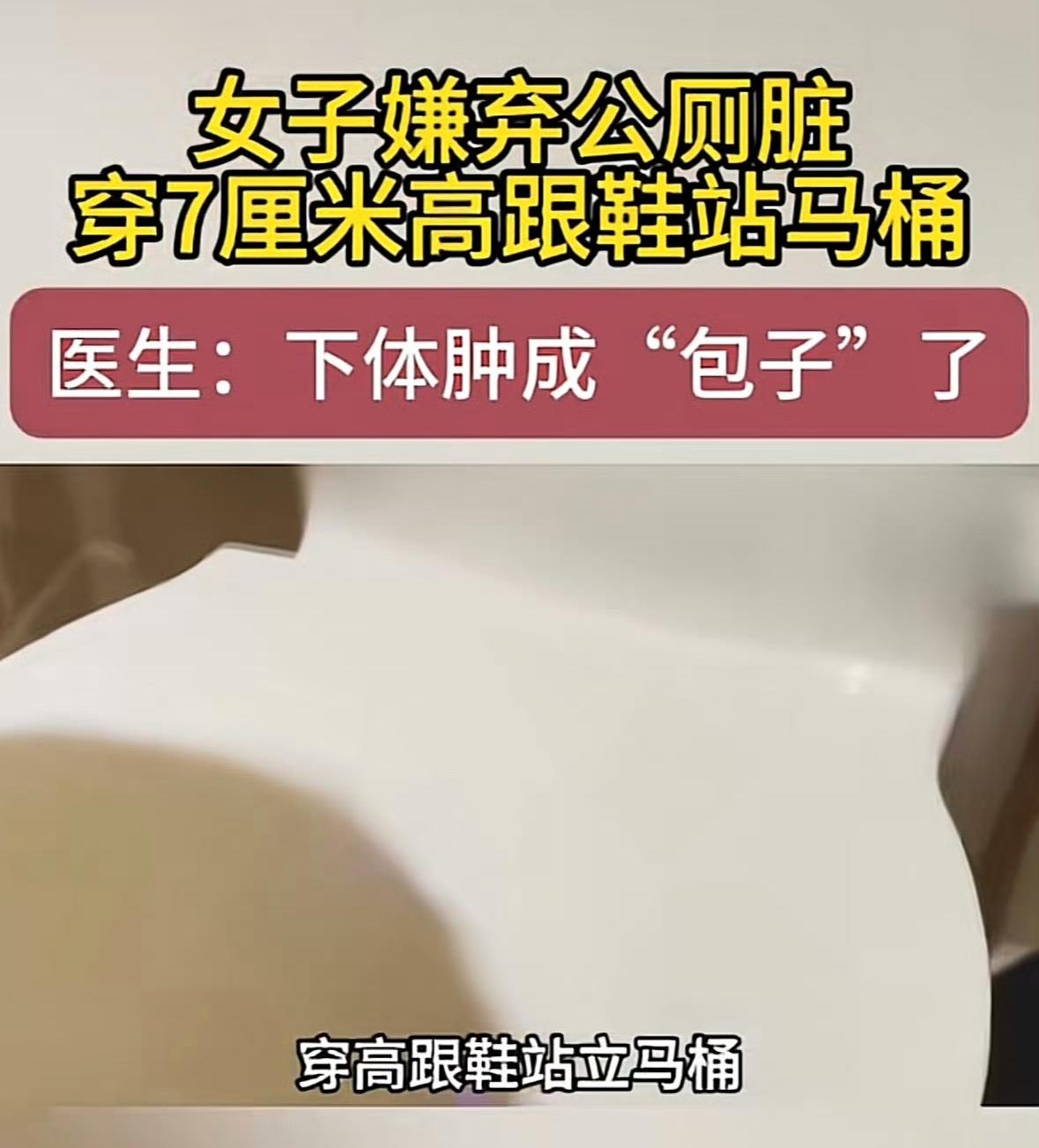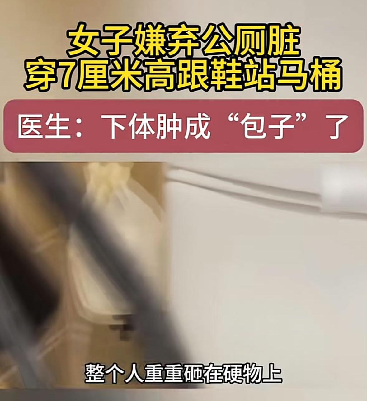 女子嫌弃公厕马桶脏,7厘米高跟鞋踩马桶踏空,导致受伤,这个动作属实高难度了。说实话,户外公厕、机场、酒店等公共场合就不适合搞马桶,一般人只要讲究的都不敢一屁股坐下去,怕不卫生,不管男的还是女滴。遇到马桶,踩上去的,蹲马步的,各种高难度如厕姿势都有,上个厕所像受刑。马桶坑