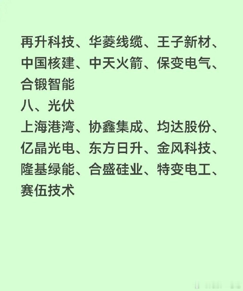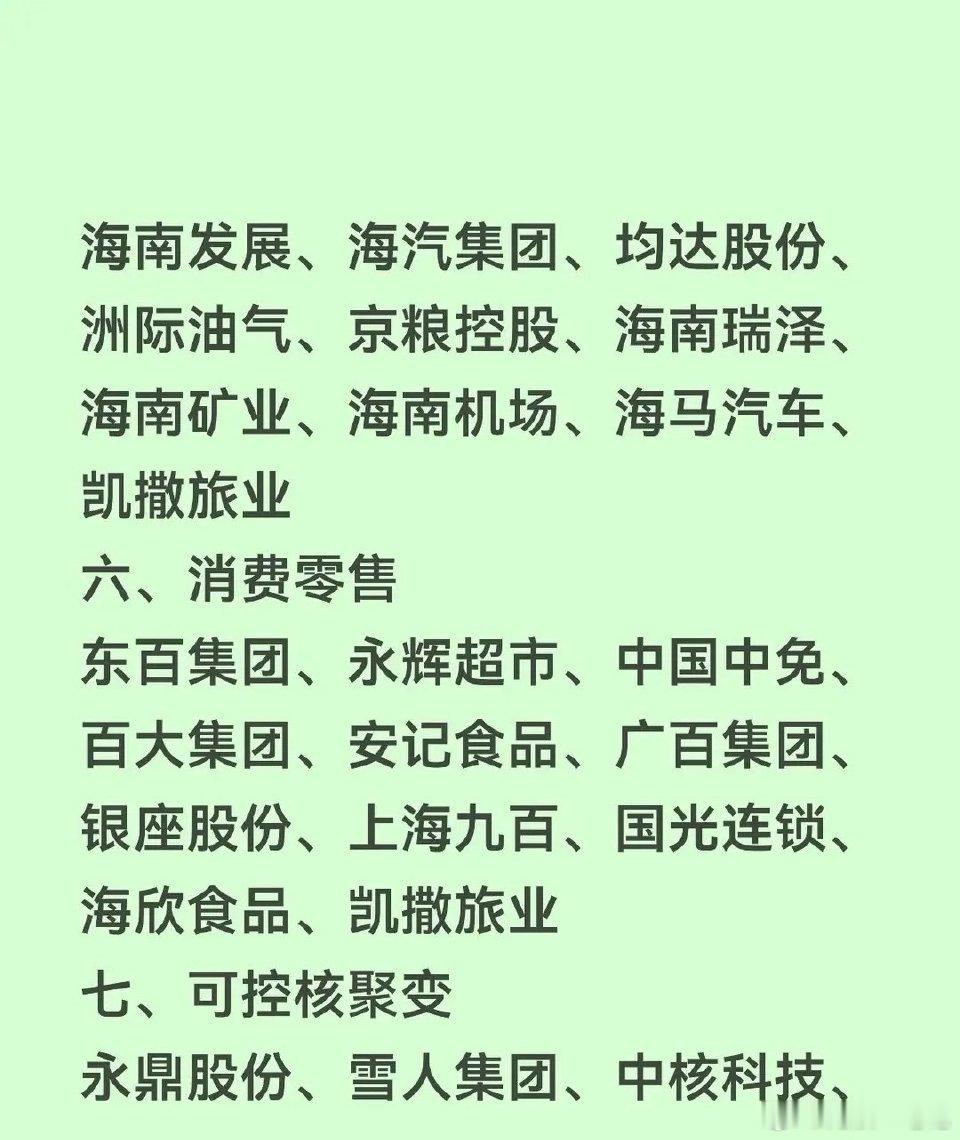 “2026产业元年,八大主线” 相关的行业和代表公司,旨在为投资或研究提供参考,并建议收藏。整体以浅绿色背景、黑色文字分条列出,结构清晰。八大主线及对应主要公司/概念:1. 商业航天 - 代表公司:航天发展、航天动力、神剑股份、通宇通讯、中超控股、西测测试、中国卫星、大业股份、中国卫通、航天电子 - (其中“航天发展”“航天动力”被特别标注)2. 固态电池 - 代表公司:天际股份、恩捷股份、丰元股份、恒大高新、多氟多、天赐材料、永兴材料、天齐锂业、赣锋锂业、永太科技3. 机器人 - 代表公司:锋龙股份、大业股份、天奇股份、泰尔股份、科森科技、宇环数控、卧龙电驱、方正电机、龙溪股份、万向钱潮4. 存储芯片 - 代表公司:德明利、香农芯创、兆易创新、万通发展、三孚股份、东芯股份、江波龙、紫光国微、中电港、生益科技5. 海南自贸区 - 提及板块,但图片中未列出具体公司名单(后续在第 3 张图中补充了海南相关企业)。6. 消费零售 - 代表公司:东百集团、永辉超市、中国中免、百大集团、安记食品、广百集团、银座股份、上海九百、国光连锁、海欣食品、凯撒旅业7. 可控核聚变 - 代表公司:永鼎股份、雪人集团、中核科技8. 光伏 - 代表公司:上海港湾、协鑫集成、均达股份、亿晶光电、东方日升、金风科技、隆基绿能、合盛硅业、特变电工、赛伍技术结论:这八大主线覆盖了航天、新能源(固态电池、光伏)、高端制造(机器人、存储芯片)、区域经济(海南自贸区)、消费、前沿能源(可控核聚变)等热点产业,适合作为 2026 年产业趋势与投资机会的参考清单。