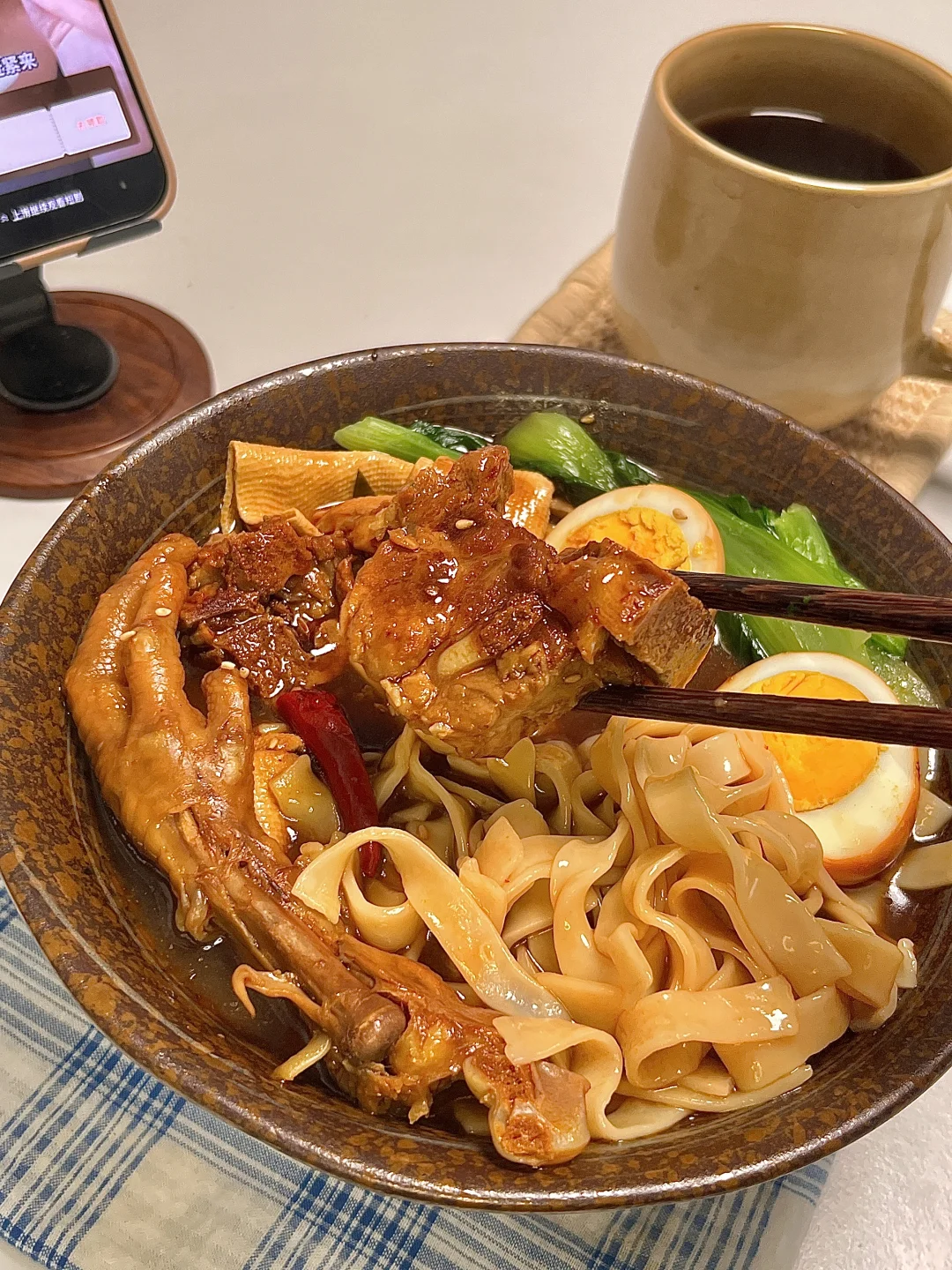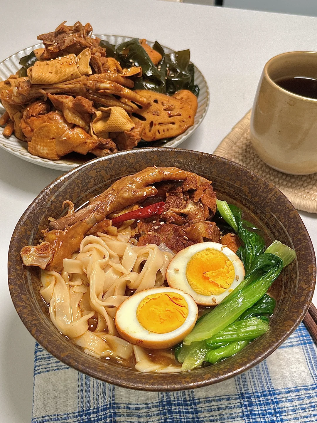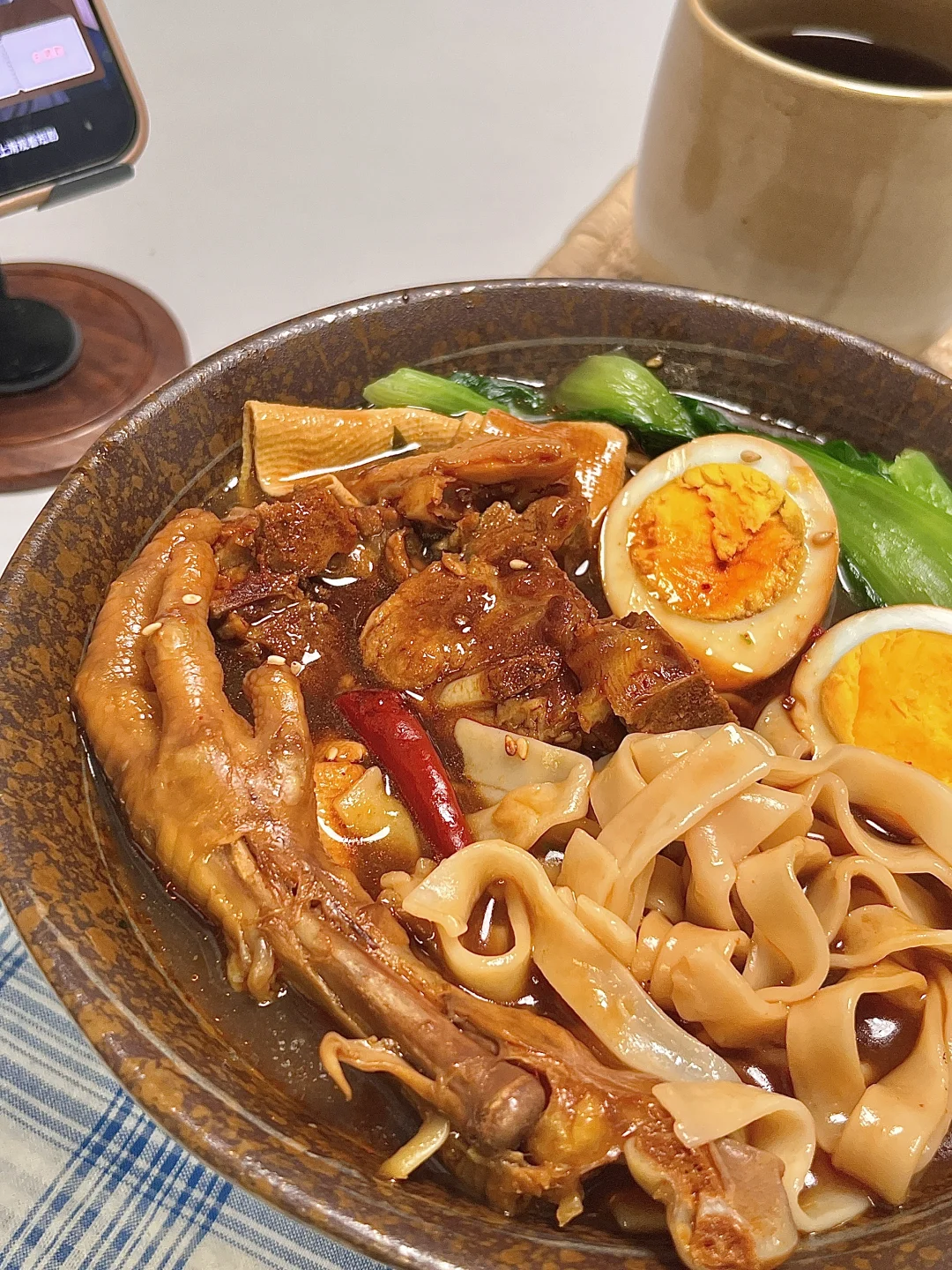 今日份一人食: 热卤面 黑咖啡 . 被这碗热气腾腾卤味面狠狠拿捏了🤤 卤到软烂脱骨的鸡爪,卤蛋吸满了汤汁,面条裹着浓郁的卤汁,配着麻辣咸香的卤味,边追剧边嗦面 太快乐啦! 爱吃的宝一定要去试试呀✌🏻