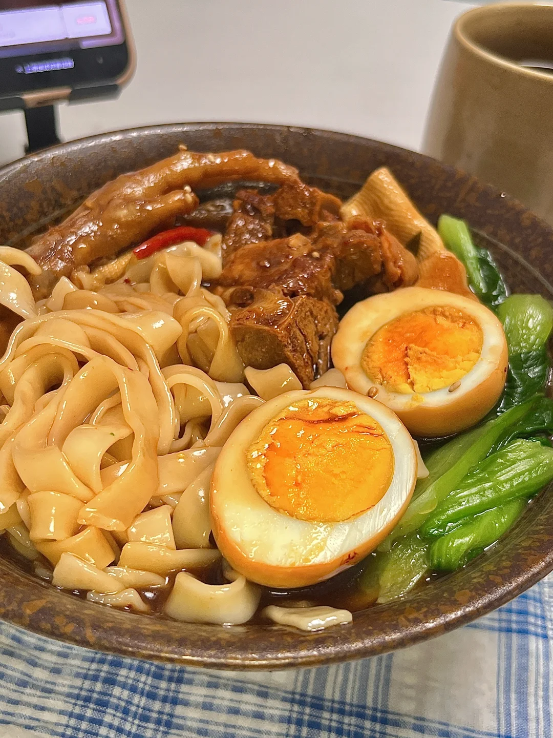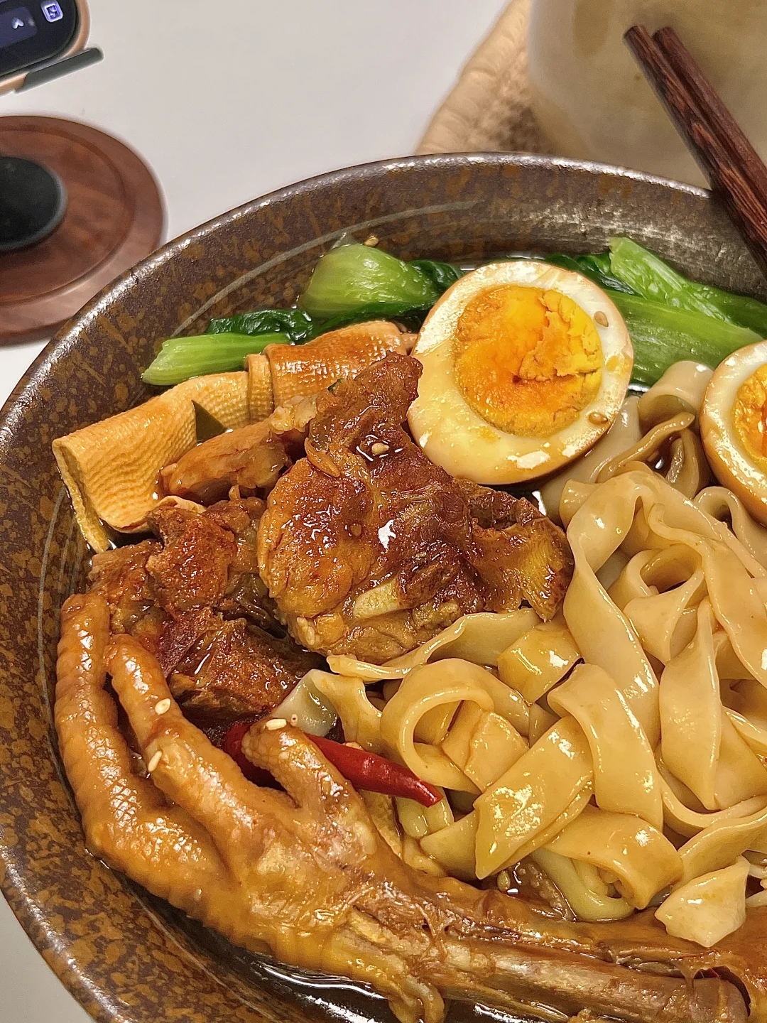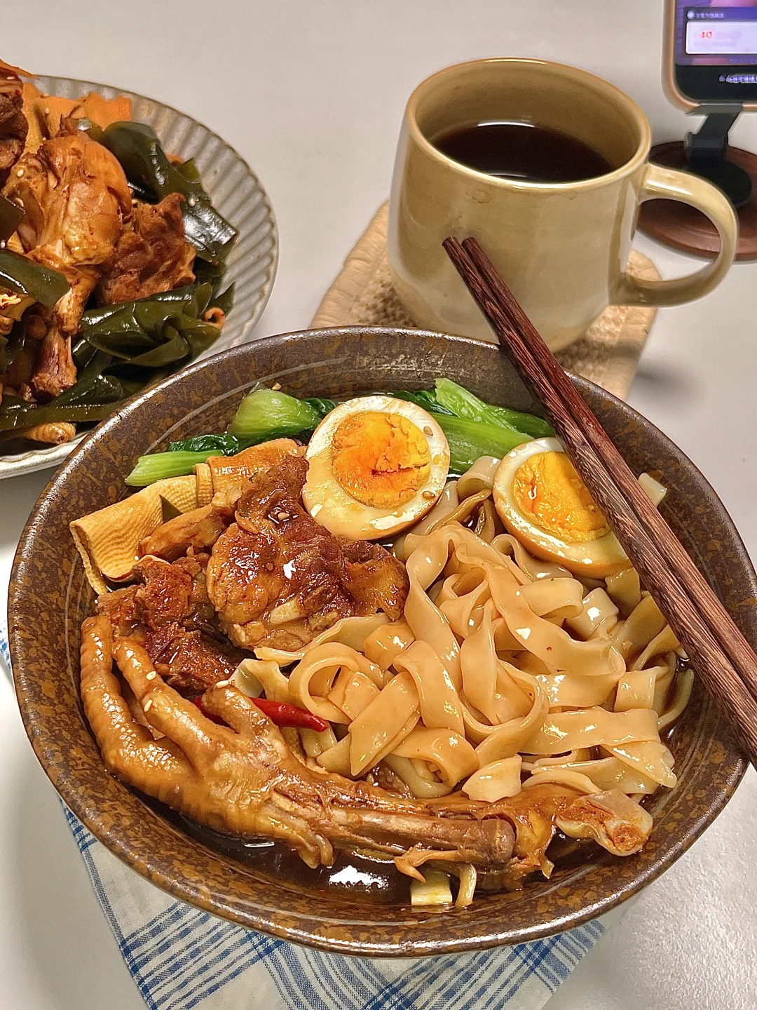 今日份一人食: 热卤面 黑咖啡 . 被这碗热气腾腾卤味面狠狠拿捏了🤤 卤到软烂脱骨的鸡爪,卤蛋吸满了汤汁,面条裹着浓郁的卤汁,配着麻辣咸香的卤味,边追剧边嗦面 太快乐啦! 爱吃的宝一定要去试试呀✌🏻
