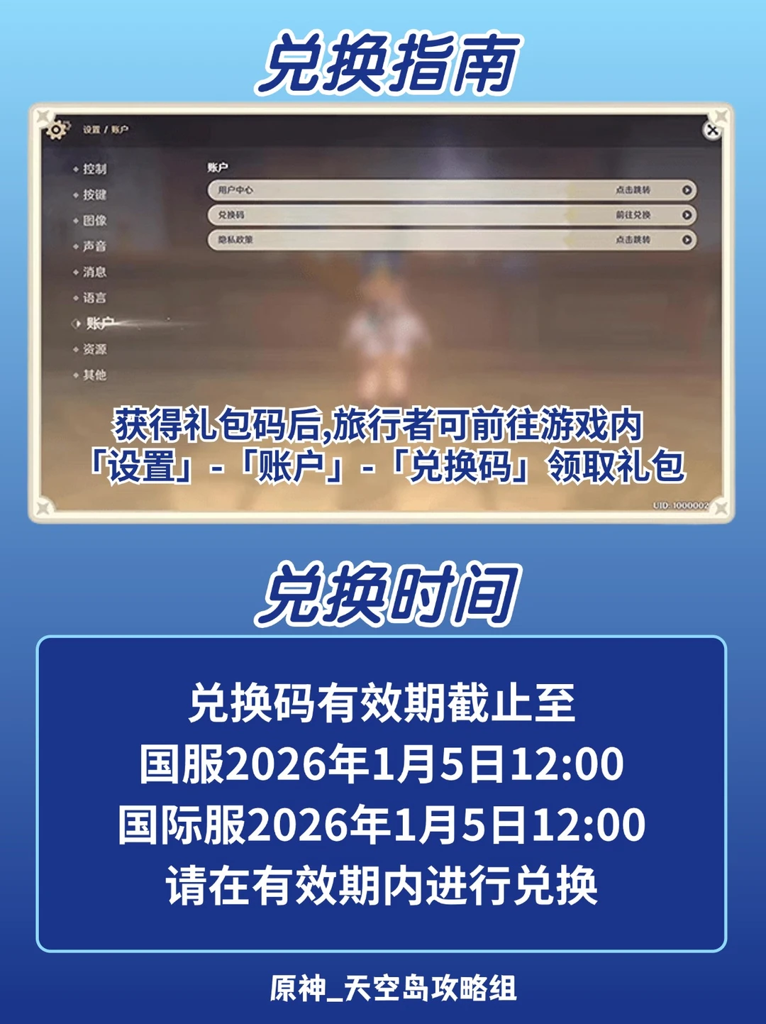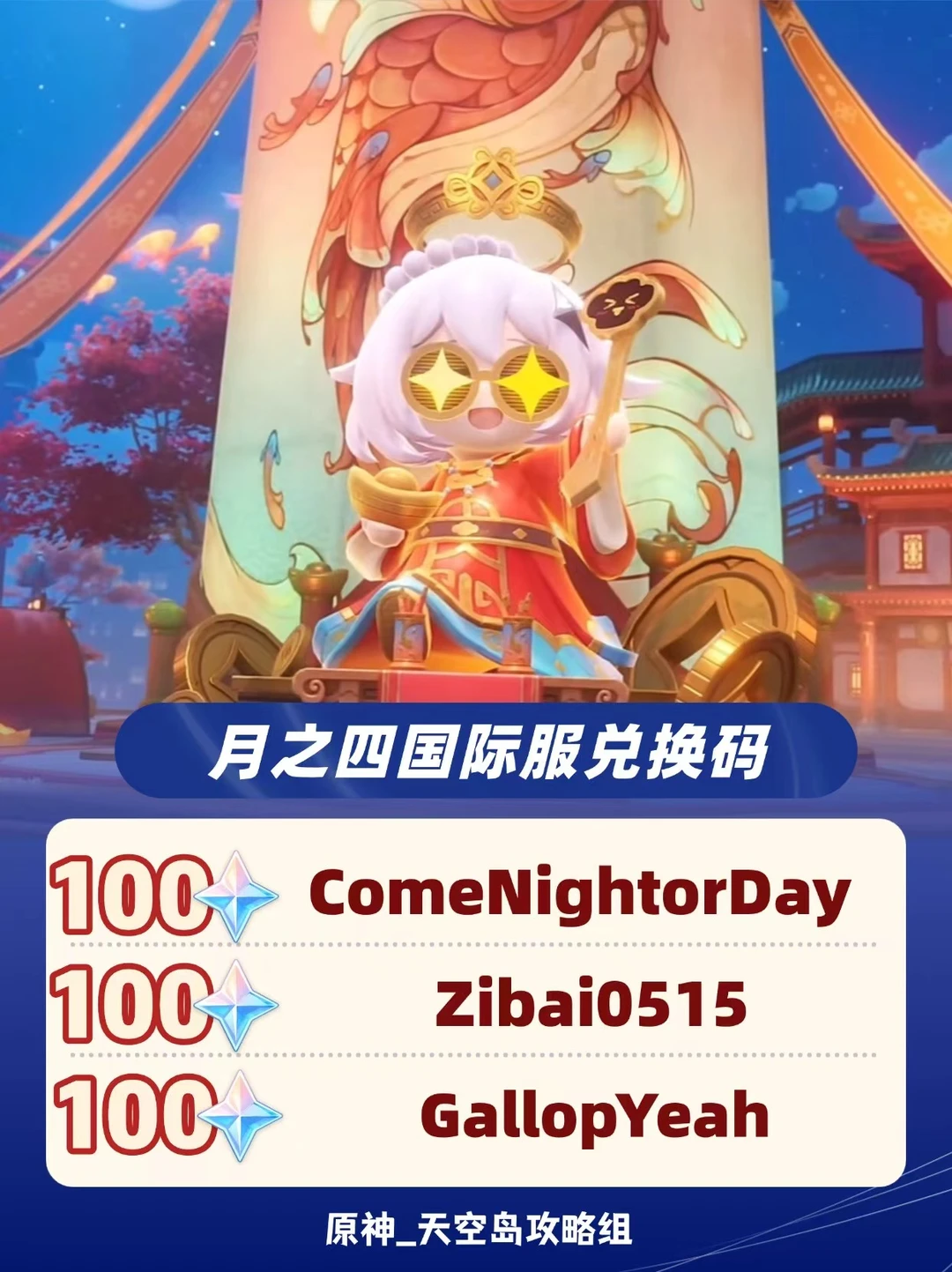 《原神》「月之四」版本前瞻兑换码已更新🚧 国服兑换码 ①如果在冬夜一个旅人 ②海灯节快乐 ③兑换码兑换马 国际服兑换码 ①ComeNightorDay ②Zibai0515 ③GallopYeah ps:左上角派蒙--设置--账户--兑换码