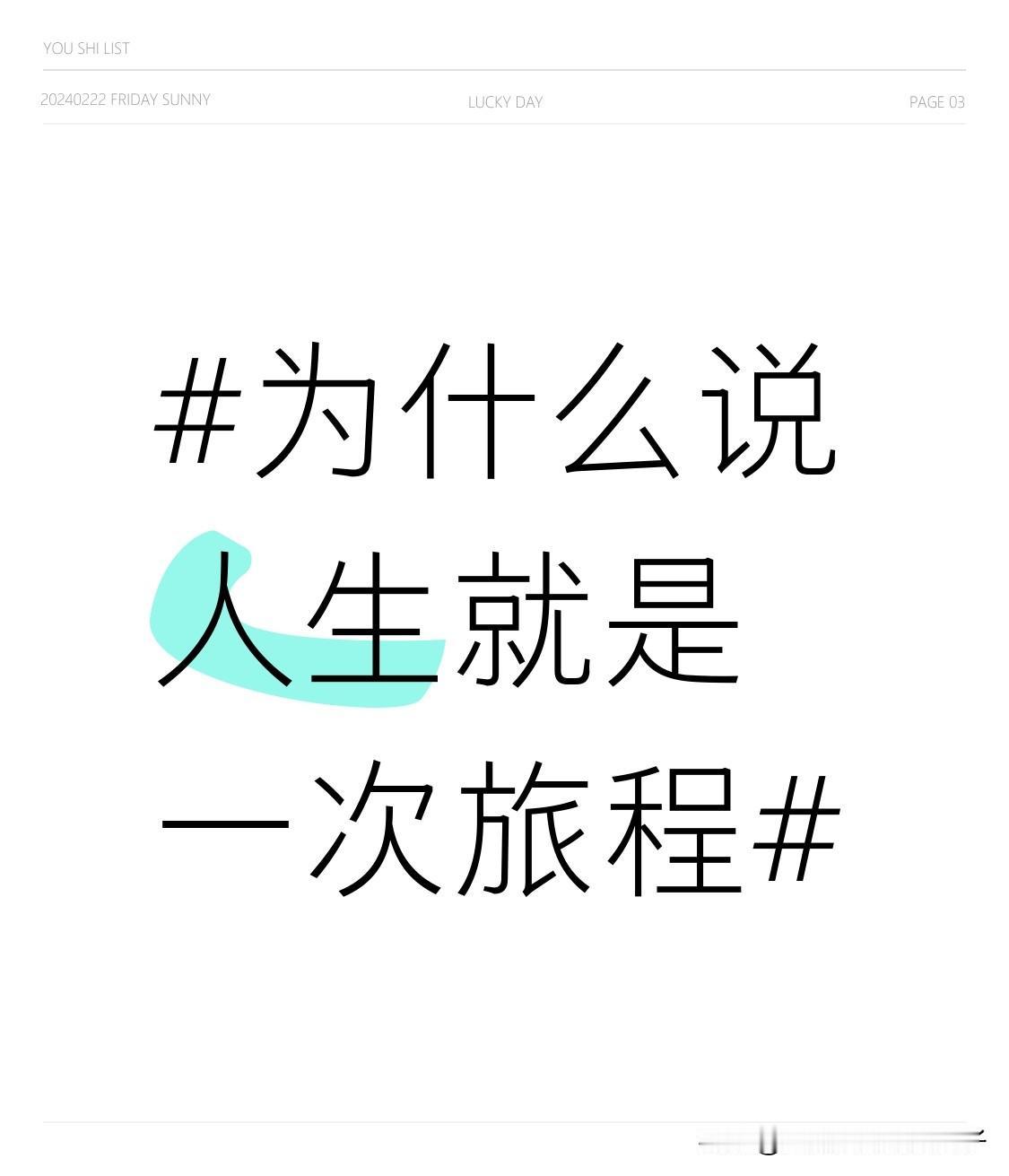 人生就是一次旅程,这说法太妙了。从出生开始,我们就像踏上一趟不知终点的列车。一路上,风景变幻无穷。 童年是满是糖果与幻想的花园,青春是一场激情四溢的冒险,中年是肩负责任的跋涉,老年则是回首往事的宁静港湾。 这旅程里,有阳光灿烂的美景,也有风雨交加的考验。我们会遇到志同道合的旅伴,也会和一些人分道扬镳。而且这是一趟单程旅行,没法回头。所以,遇到迷路时别慌,那是成长的磨砺。珍惜每一处风景,每一个同行者,好好享受这场独一无二的人生之旅。