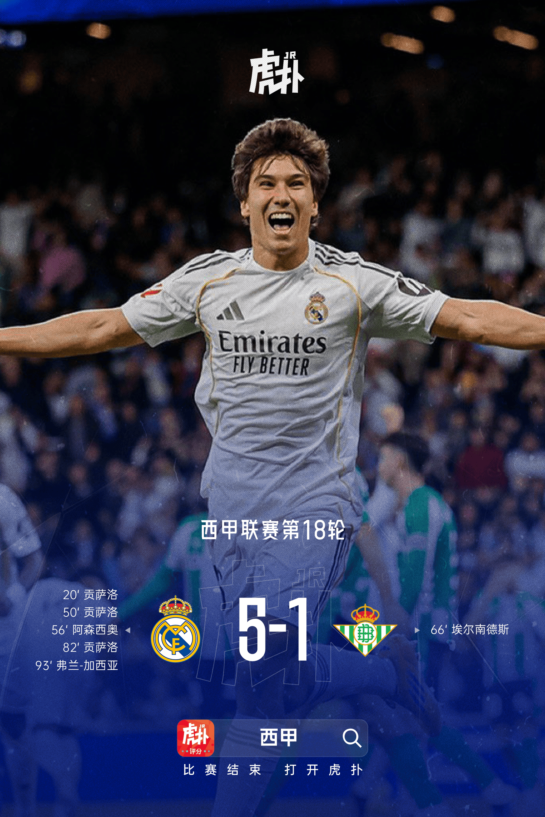 虎扑01月05日讯西甲第18轮,皇马主场5-1大胜皇家贝蒂斯,青训中锋贡萨洛-加西亚在比赛中上演了完美帽子戏法。