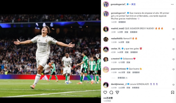 他也在赛后通过社媒晒出自己的庆祝照,并配文:“多么棒的新年开局!我在伯纳乌球场打进了我的首粒(西甲)进球,还上演了帽子戏法,这真是一个特别的下午。非常感谢皇马球迷们!”