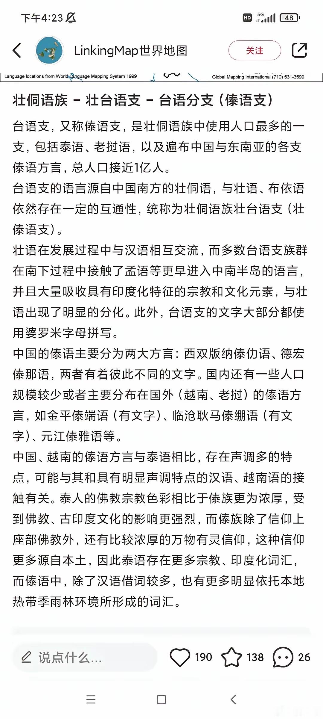 西南夷的后裔主要分布在壮傣侗语系民族中。汉朝的汉军与西瓯骆越军团讨伐云南四大古国与贵州夜郎国混血的后裔就是壮傣侗语系民族。全球壮傣侗语系人口约为1.15亿,包括中国境内的3155万和东南亚的8300万。包括中国境内的壮族、侗族等约3155万,以及东南亚的泰族、佬族等约8300万。傣族,泰人,老挝人,掸邦人是一个民族。东南亚最大民族了,分布超过4个国家。这个语系存在多种命名方式(壮侗语族/侗台语族/台-卡岱语系),国际学界已普遍视为独立语系。和明确其包含三大语支:壮傣语支(壮/傣/布依语)、侗水语支(侗/水/毛南语)、黎语支,这与的记载一致。值得注意的是提到仡央语支作为第四分支,但指出其濒危现状。综合和可确定核心分布区在中国华南至东南亚,的跨境民族案例(如版纳壮族兼用傣语)尤其值得强调。关于壮傣侗语系的分类与特征,综合可信资料整理如下:一、分类体系与核心语支该语系在国际学界多称“侗台语系”或“台-卡岱语系”,包含以下主要分支:壮傣语支含壮语、布依语、傣语(含西双版纳傣泐文、德宏傣那文等方言)。北部方言与南部方言以郁江-右江-邕江为界分布。侗水语支包括侗语、水语、仫佬语、毛南语、拉珈语等,集中分布于黔桂湘交界地带。黎语支以海南黎语为代表,部分学者将其单列。仡央语支含仡佬语、布央语等,属濒危语言,分布于中越边境。二、语言分布与跨境特征地理范围:以中国广西、云南、贵州为核心,延伸至东南亚(泰国、老挝、越南、缅甸)及印度阿萨姆地区。跨境现象:傣语与泰语、老挝语亲缘密切;云南部分壮族(自称“傣养”)因长期杂居可流利使用傣语。三、历史渊源与学术争议起源假说:遗传与考古证据指向上古中国云南贵州新石器农耕人群,与南岛语系可能存在同源关系。民族学溯源为古代“西南夷”后裔。系属争议:早期归为汉藏语系,因缺乏严格语音对应规律,现主流视为独立语系。四、现状与挑战使用人口:约2300万,但仡央语支等多处于极度濒危状态。保护压力:云南广西等地民族语言面临弱化衰退,通用普通话推广加速方言消退。注:术语使用需注意——“壮侗语族”为早期汉藏语系框架下的旧称,当前国际研究更倾向“侗台语系”的独立分类体系。