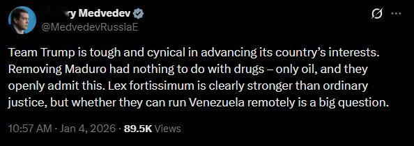 🚨🇻🇪🇷🇺 俄罗斯前总统梅德韦杰夫:“推翻马杜罗与毒品无关……只与石油有关,他们也公开承认这一点” 俄罗斯前总统德米特里·梅德韦杰夫就委内瑞拉局势发表评论: “特朗普团队为了推进本国利益,手段强硬且冷酷无情。推翻马杜罗与毒品无关,只与石油有关,他们也公开承认这一点。 ‘强权法则’显然凌驾于普通法律之上,但他们能否远程操控委内瑞拉仍是一个大问题。” “强权法则”是拉丁语,意为“强者之法”。 本质上就是:强权即公理。 梅德韦杰夫的意思是,美国并非依据法律行事,而是依靠赤裸裸的武力。 而且他对此并不感到愤怒。 只是质疑他们是否真的能成功。 莫斯科方面出人意料地冷酷无情,颇具算计。 来源:@MedvedevRussiaE 🚨🇻🇪🇷🇺 RUSSIA'S MEDVEDEV: "REMOVING MADURO HAD NOTHING TO DO WITH DRUGS... ONLY OIL, AND THEY OPENLY ADMIT THIS" Former Russian President Dmitry Medvedev weighing in on the Venezuela operation: "Team Trump is tough and cynical in advancing its country's interests. Removing Maduro had nothing to do with drugs, only oil, and they openly admit this. Lex fortissimum is clearly stronger than ordinary justice, but whether they can run Venezuela remotely is a big question." "Lex fortissimum" is Latin for "the law of the strongest." Essentially: might makes right. Medvedev is saying the U.S. isn't operating on legal grounds, just raw power. And he's not even mad about it. Just questioning whether they can actually make it work. A surprisingly cold, calculating take from Moscow. Source: @MedvedevRussiaE