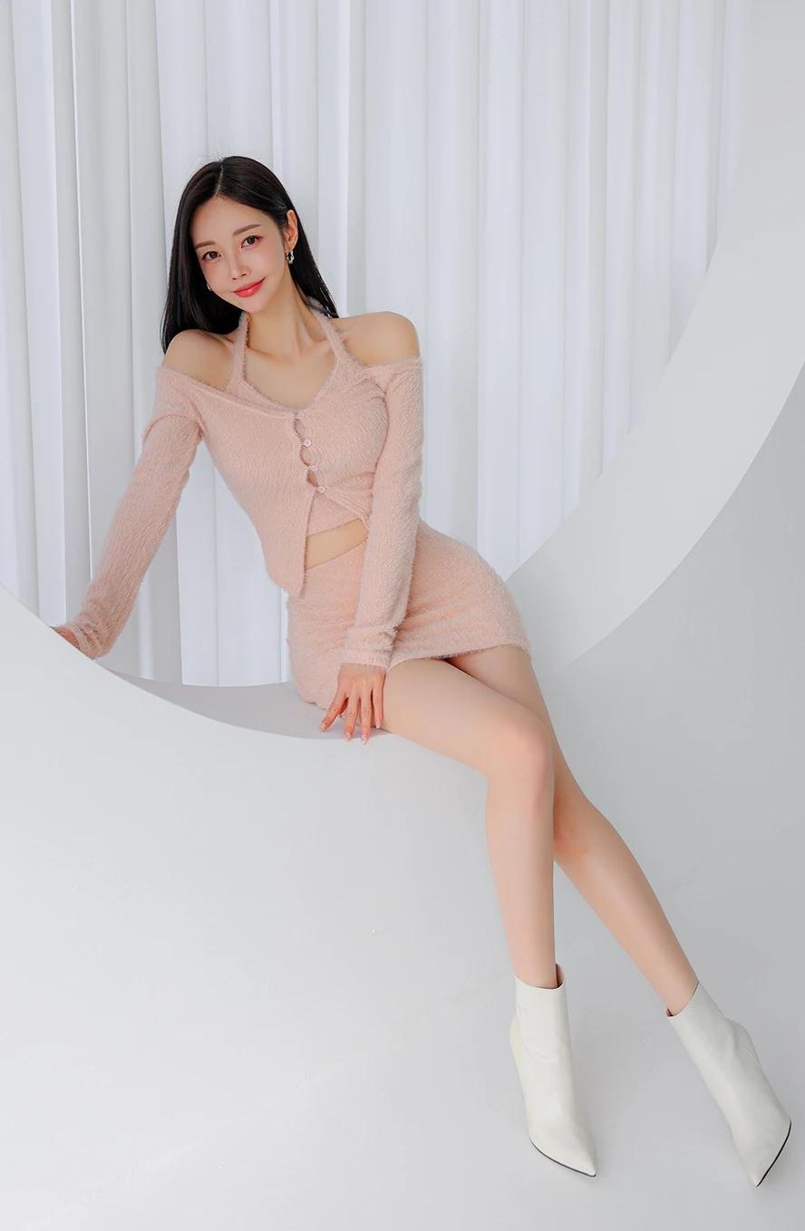 孙允珠这甜美粉色毛衣裙搭配白色高跟靴,简直是时尚教科书! 粉色毛衣套裙用的是软糯