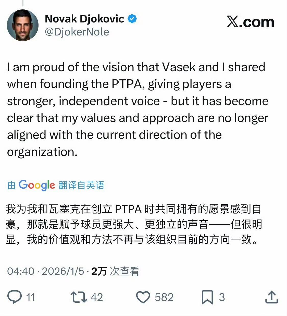 不管真相如何,对于现阶段的德约来说,能摆脱场外的宫斗纷扰,都会是一个大优局面。 所以……德约科维奇深夜在个人平台连发三帖,郑重声明,将正式退出自己联合创立的职业网球选手协会PTPA。
