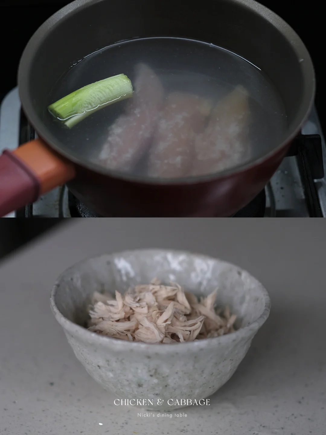 •放进锅中,加一段大葱,加水没过鸡肉,小火煮开后关火,放凉后剥成细丝。
