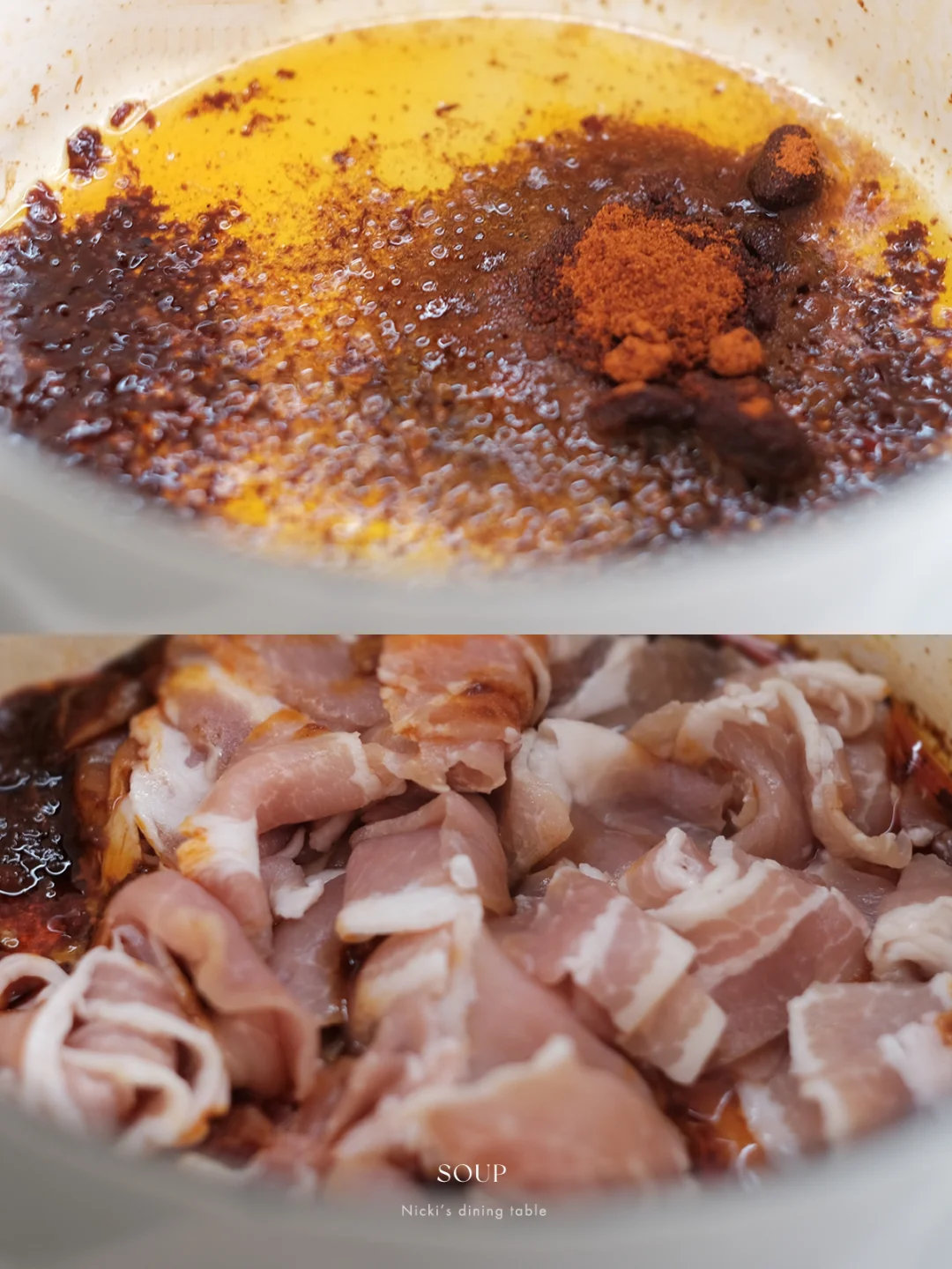 •深锅中倒油,加入一大勺韩式辣酱,小火炒散后加入1大勺韩式辣椒粉炒匀(如果很能吃辣的话可以根据自己口味多加一些辣椒粉)倒入五花肉,炒至表面变色后加水。