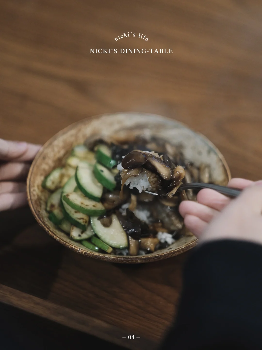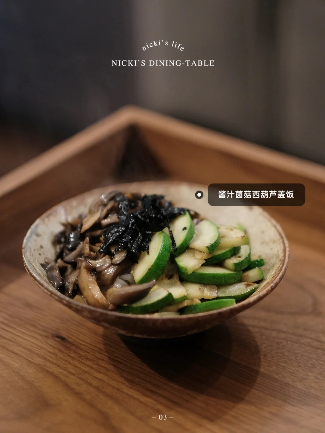 • 盛一碗米饭,将西葫芦片煎熟加少许盐调味,米饭淋上菌菇酱汁,码上菌菇、西葫芦,撒上海苔即可。
