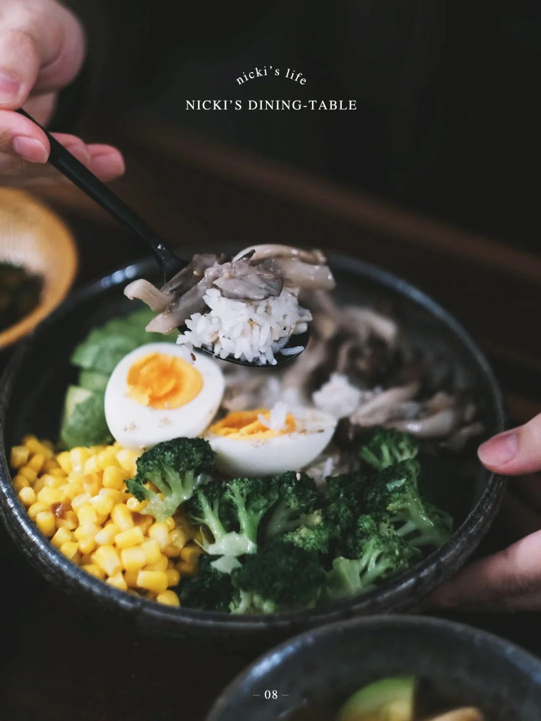 • 西兰花,玉米粒水里汆一下,煮一个白煮蛋,牛油果半个切片,平菇撕条备用。