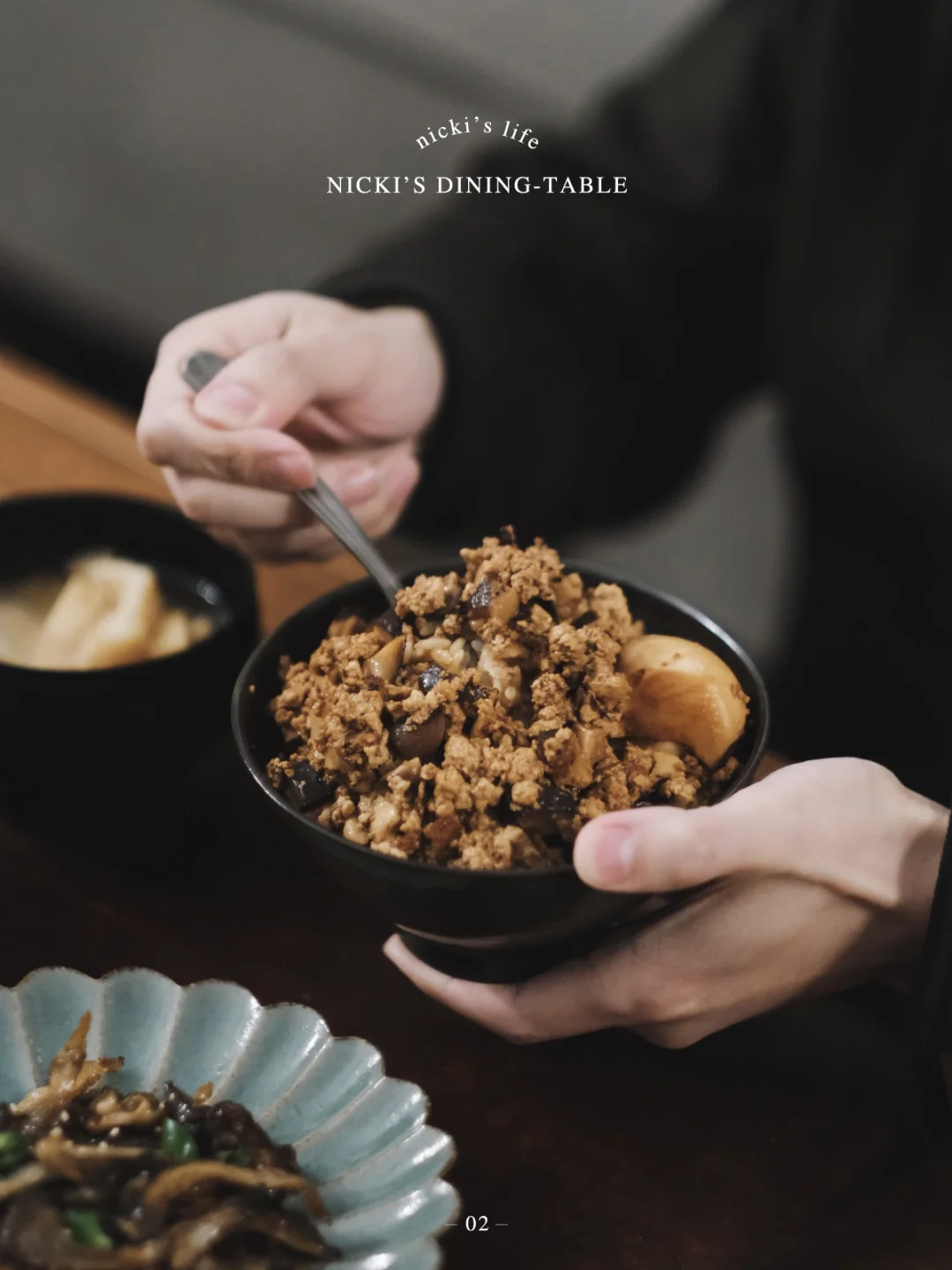• 香菇切小丁,下锅炒干水分后倒出豆腐碎翻炒均匀,加入洋葱酥,一个白煮蛋,2-3勺生抽、一勺老抽、少许糖,一碗水,盖上锅盖小火煮10分钟左右即可。