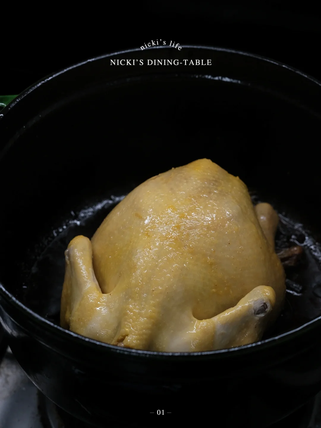 ·铸铁锅中用刷子薄薄刷一层油,铺上葱段,将鸡放在葱段上,淋一圈料酒,盖上锅盖中火煮大概5分钟转小火继续煮15分钟,关火不要立马开盖,余温再焖5分钟即可。