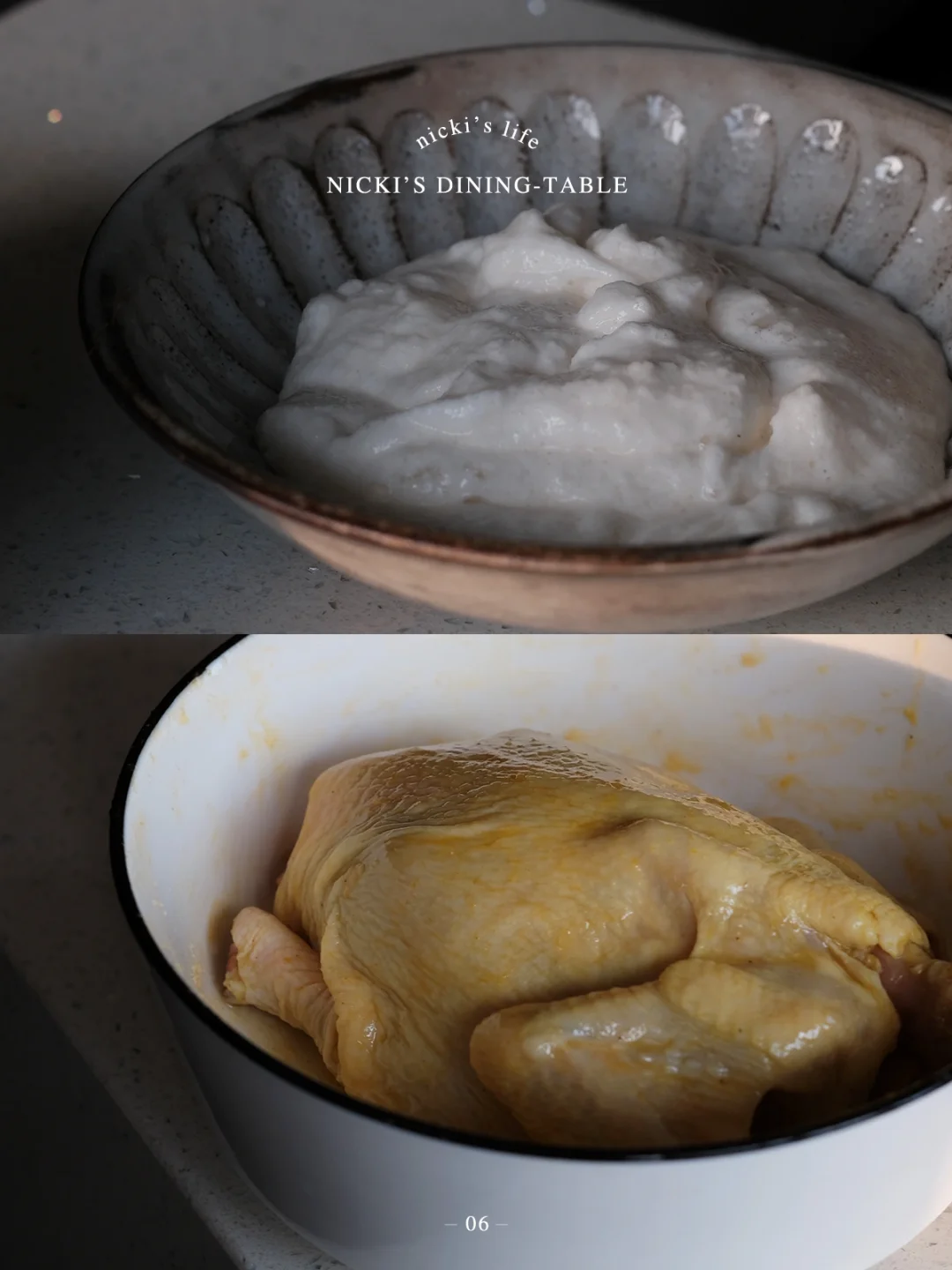 ·将盐焗粉和一勺花生油调匀,把鸡的表面和里面都要抹到才入味,静至30分钟。