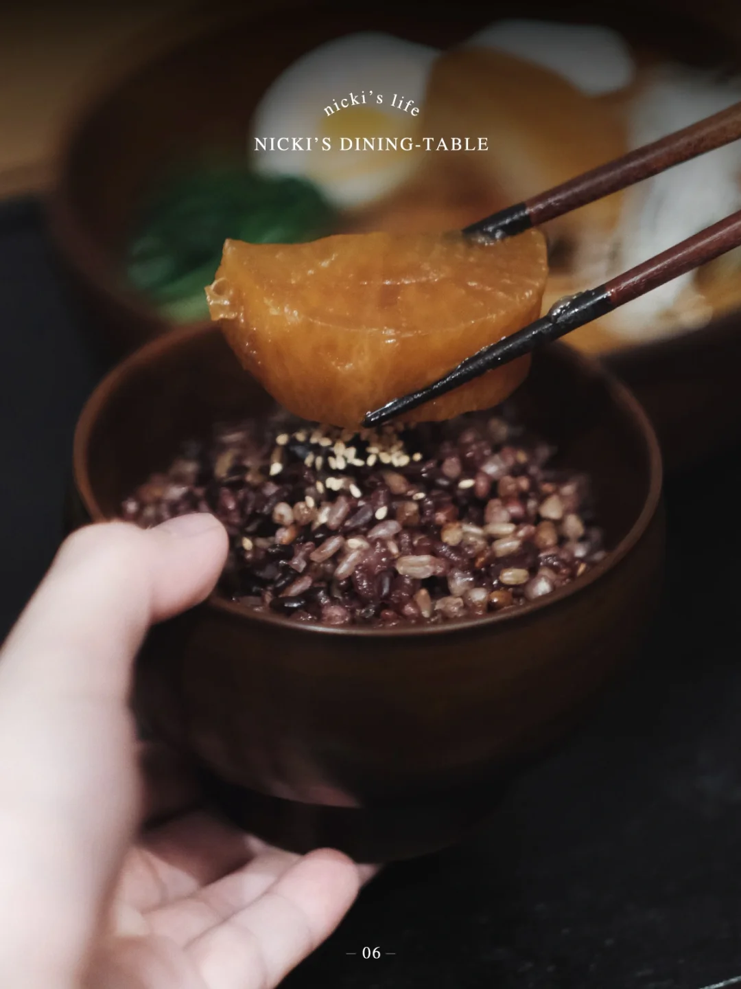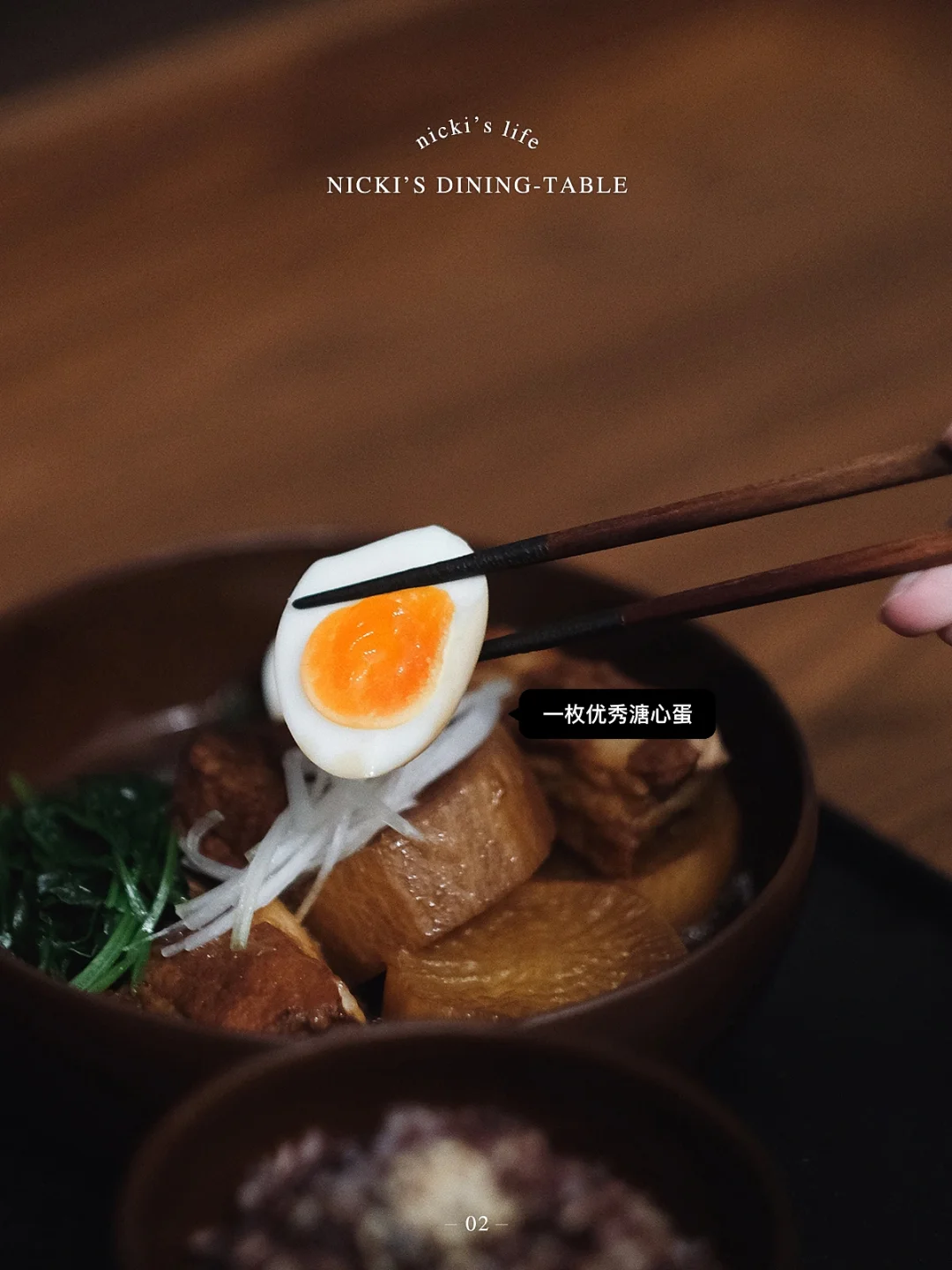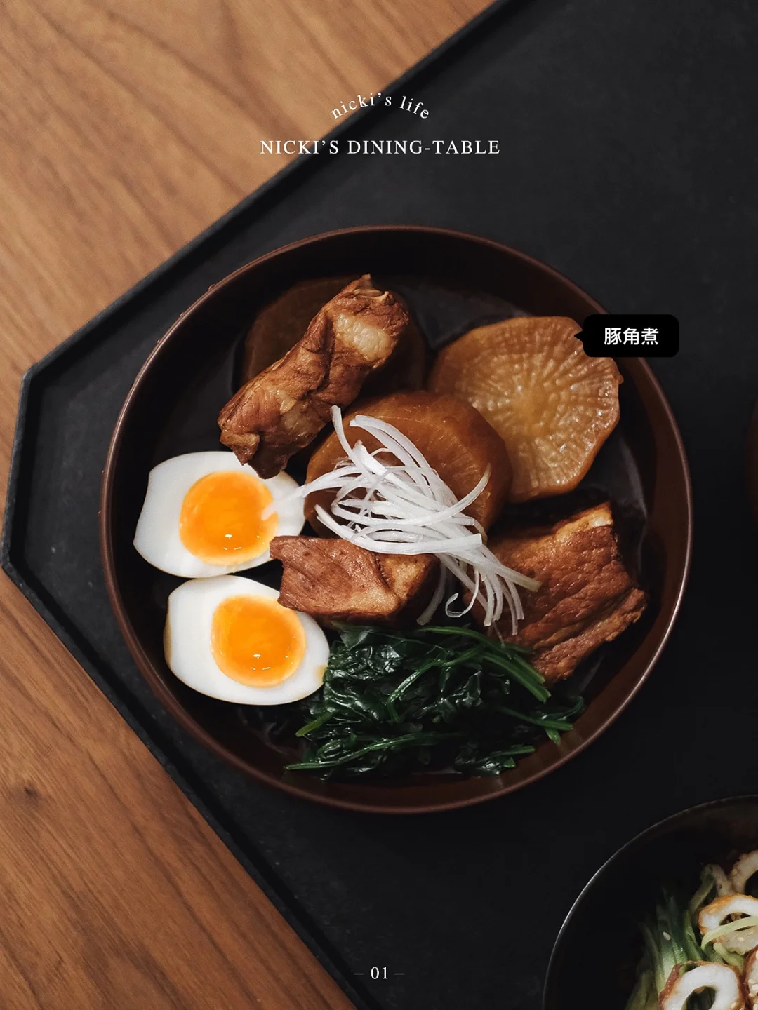 日本料理的色彩搭配法就是所谓的五色原则:红黄绿白黑。在制作的过程中可以参考这五种色彩搭配,虽说是为了审美,但其实饮食也能更营养均衡。就拿我今天的豚角煮为例,加入了蔬菜和即食溏心蛋,让整道菜的视觉更鲜艳了不少。