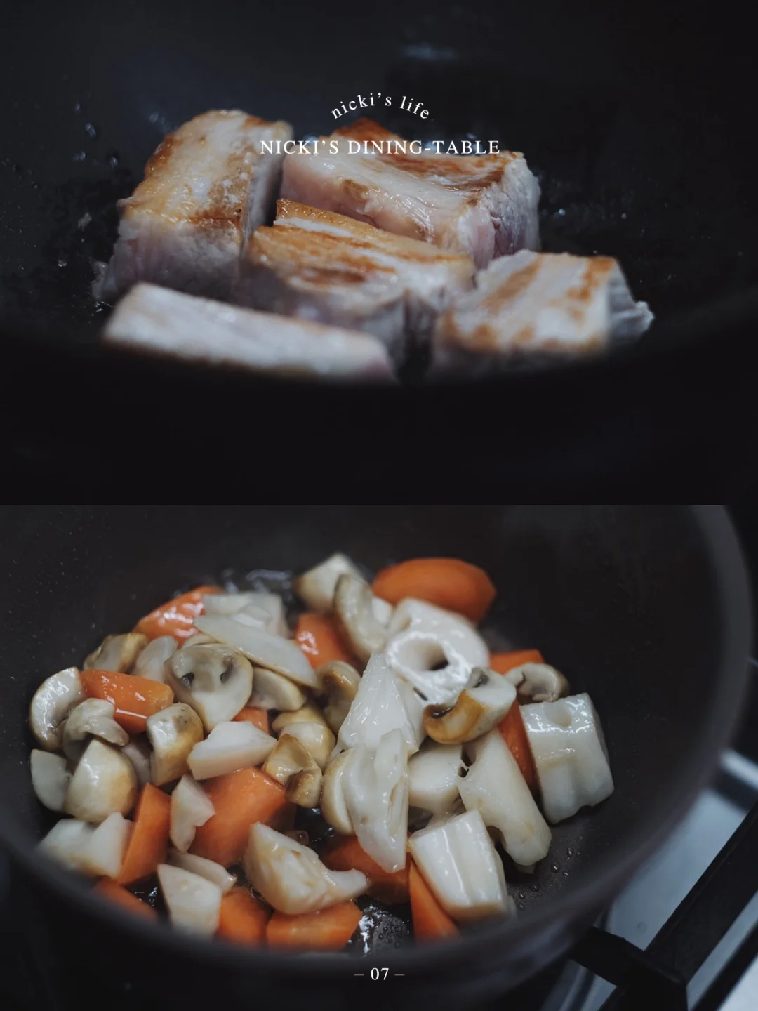 •取一炖锅,锅中煮水,水开后,放入煎好的五花肉,倒入2大勺清酒、1大勺老抽、2大勺味淋、2大勺生抽、适量冰糖盖上锅盖煮40分钟左右。