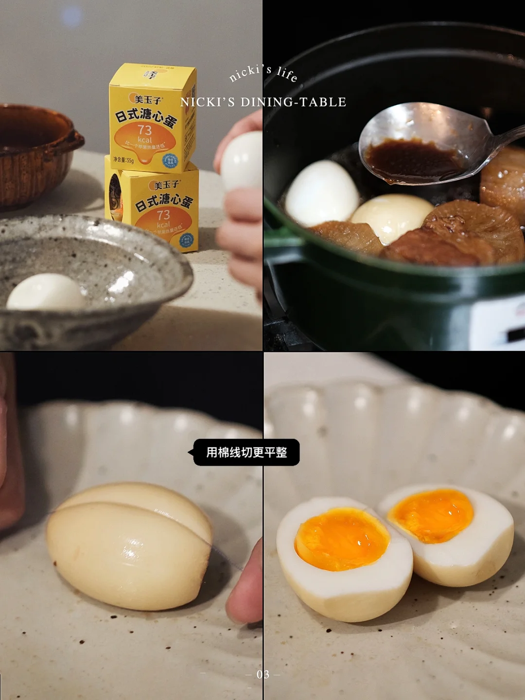 •将溏心蛋放入五花肉萝卜锅中(不要开火,这样放入的溏心蛋就太熟了),用勺子淋汤汁在溏心蛋上,让它上些色后取出,用棉线对半切(这样切出来的蛋黄更平整一些)。