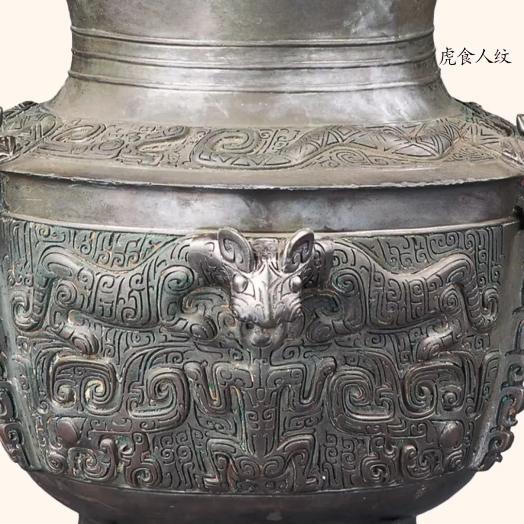 青铜尊在商代是祭祀、宴飨等礼仪活动中的重要礼器。 龙虎纹青铜尊于1957年在安徽阜南月儿河出土,后入藏安徽省博物馆。1957年6月的一天,家住朱寨区台家寺附近的村民徐庭兰和往常一样来到小润河撒鱼。他使劲撒网的时候脚下一蹬,发现一个铜器,同时还发现觚爵斝7个大小各异青铜制器物。此后安徽省文化厅派出专家进行考察鉴定。那件较大的就是后来我们所熟知的商代龙虎尊。据推断,在商代,一个名叫“淮夷”的古老族群,就生活在中国淮河流域。淮夷族和商王朝关系密切,文化交流非常频繁。商龙虎纹青铜尊极有可能是洪水泛滥、河道变迁后,把埋藏在附近地下“淮夷”族人墓葬的随葬品,冲入了河里。 1958年9月,毛泽东主席视察安徽省博物馆观赏龙虎尊时,高兴地说:“中国青铜器是中国古代劳动人民智慧的结晶,此尊可速送国家历史博物馆,让全世界的人都知道中国在3500年前从事科技文化生产创造的财富和劳动人民的智慧……”。1959年春,遵照毛主席的指示,龙虎尊等被选送到北京中国国家博物馆。 器物名称:商代龙虎纹尊。 时代:商(公元前 16 世纪~前 11 世纪中期)。 收藏单位:国家博物馆。 器物规格:尊高50.5厘米、口径45厘米、腹深41.5厘米、足径24厘米,重26.2千克。 出土地点: 1957年在安徽阜南月儿河出土 。 器物介绍: 器形: 体形巨大,口沿宽广,器口侈大,束径过肩,颈部较高,下部收缩,呈大喇叭状。肩部微鼓,下折为腹,底部为弧形圜底,高圈足,上饰十字镂空。 纹饰:器颈部中间饰三道凸弦纹。器肩部饰三条曲身龙纹,长身卷尾,做爬行状,龙身为高浮雕其上饰联系的三角环纹,龙首探出肩外,为圆雕龙首。三条龙纹间饰三只夔龙纹。腹部以云雷纹为地,以扉棱为界等分三组空间,每组各装饰一组虎食人纹;虎食人纹以浮雕虎首为中心,左右双身,口含一人。人无衣冠,身饰花纹。其间各装饰三组饕餮纹。圈足饰三组饕餮纹。 虎食人纹,在河南安阳殷墟妇好墓出土的青铜钺(妇好钺)上、商后母戊鼎耳外侧及山西浑源李峪村出土的春秋晚期鸟兽龙纹壶腹部,均有类似的虎食人像。今藏于日本住友泉屋博古馆和法国赛努奇博物馆收藏的2件商虎食人卣,整器为猛虎食人的立体形象,更为逼真。在商代玉器上也见虎食人像。 作者:九芒考古。 参考资料: 朱凤瀚:《古代中国青铜器》,南开大学出版社,1995年。 青铜器 文物 博物馆 龙纹 虎纹 国家博物馆 安徽