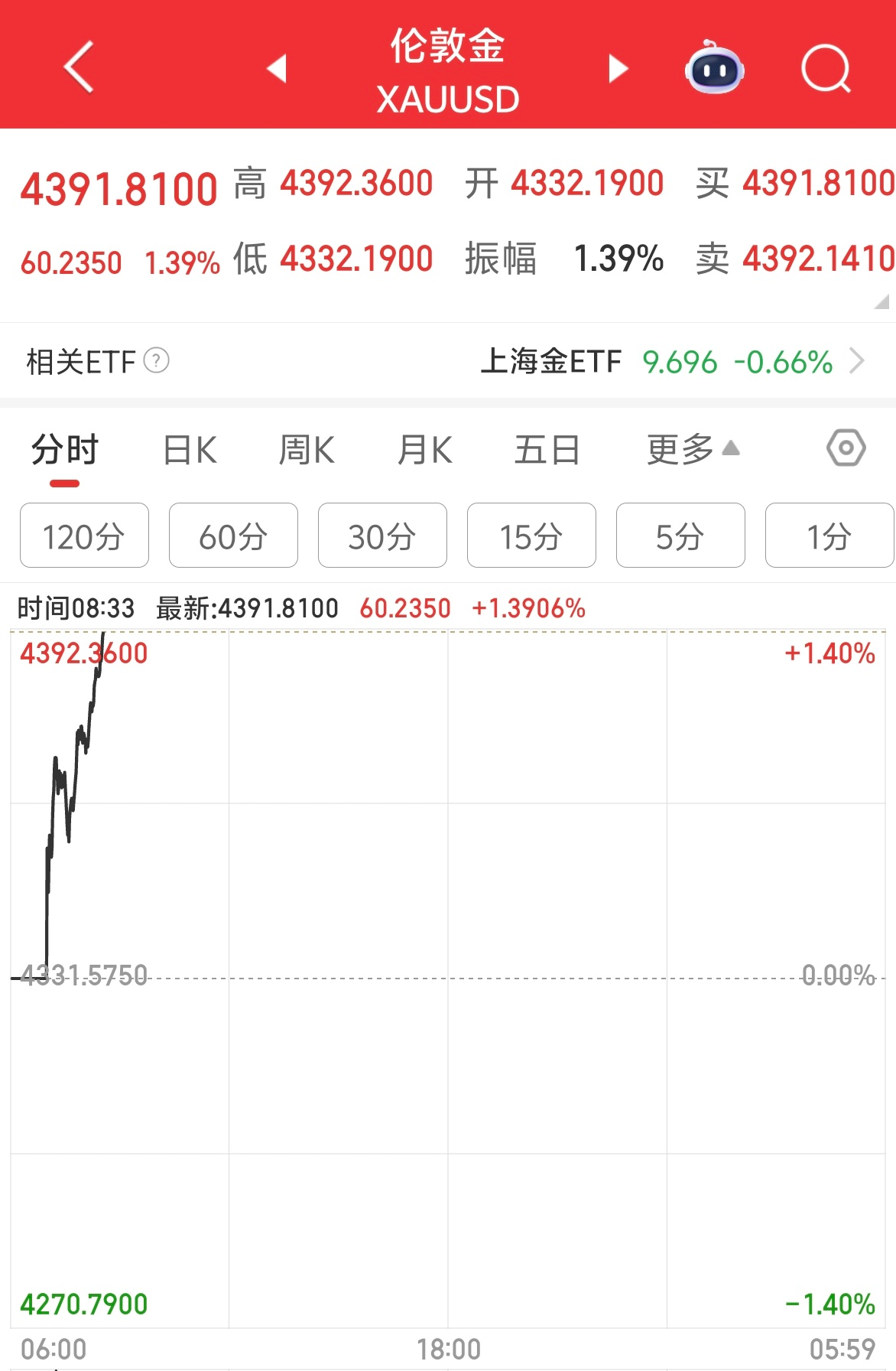 1月5日,截止发稿,现货黄金向上突破4390美元/盎司,日内上涨1.39%。现货白银向上突破75美元/盎司,日内上涨3.54%。
