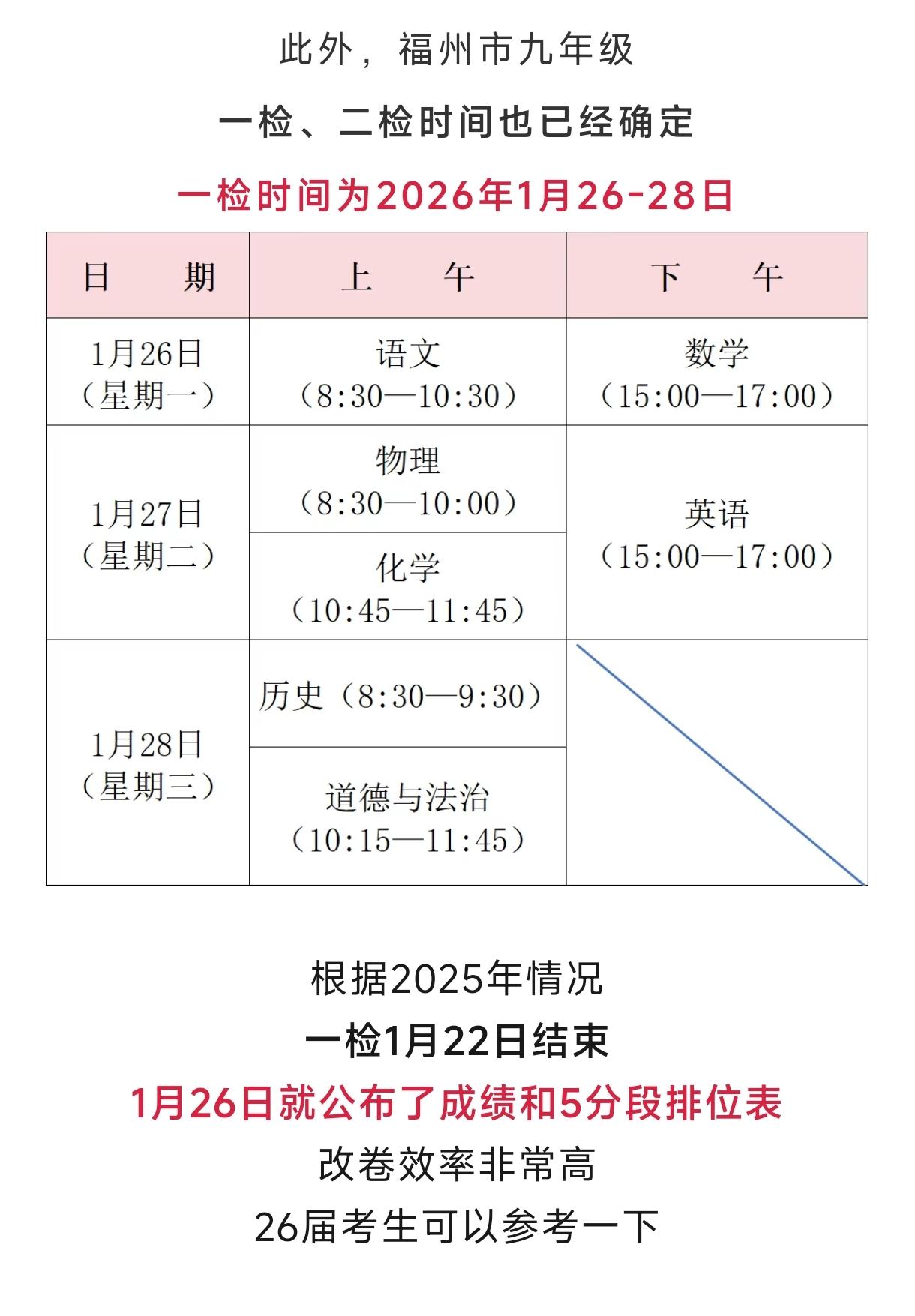 最新消息,引人关注的2026年1月福州高一、高二质量检测取消,教育部门刚刚发布,但是取消并不意味着取消高一高二期末考,期末仍然由各校自行命题安排高一高二考试。同时参照往年的惯例,2026年1月的福州九年级初三将迎来九年级适应性考试,也就是第一次质量检测考试,这个考试测试的单科学业水平以及考生全科在全市的排位,对2026中考考生报考高中有很大参考价值,目前没有上级教育部门的其它消息说取消,应该会照常进行。对此,你怎么看?参照往年的惯例,今年初三一检原定计划在1月26日-28日进行,成绩及市排名差不多在4日-5日以后查询可见,各科考试时间表如图所示,收藏并关注