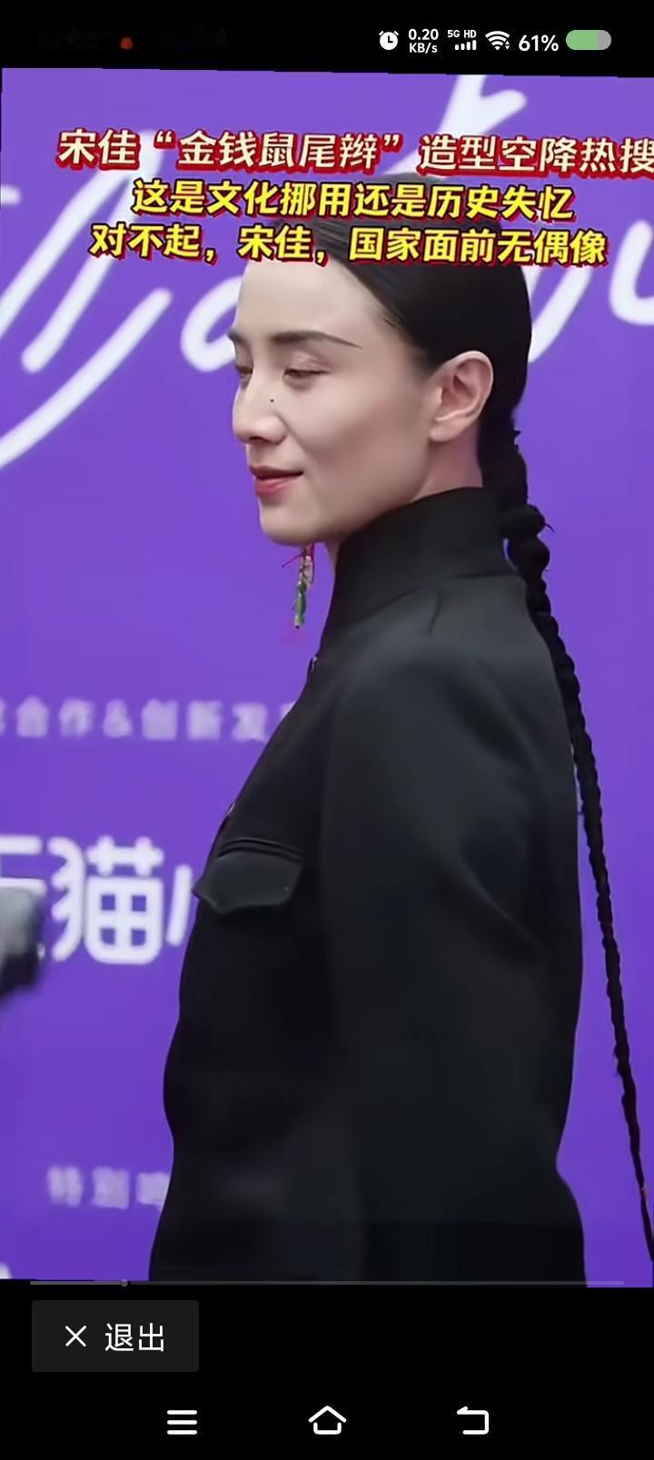 演员宋某又火了?—— 网上信息:演员宋某发饰引争议,批评者认为这有“清辫”遗风。