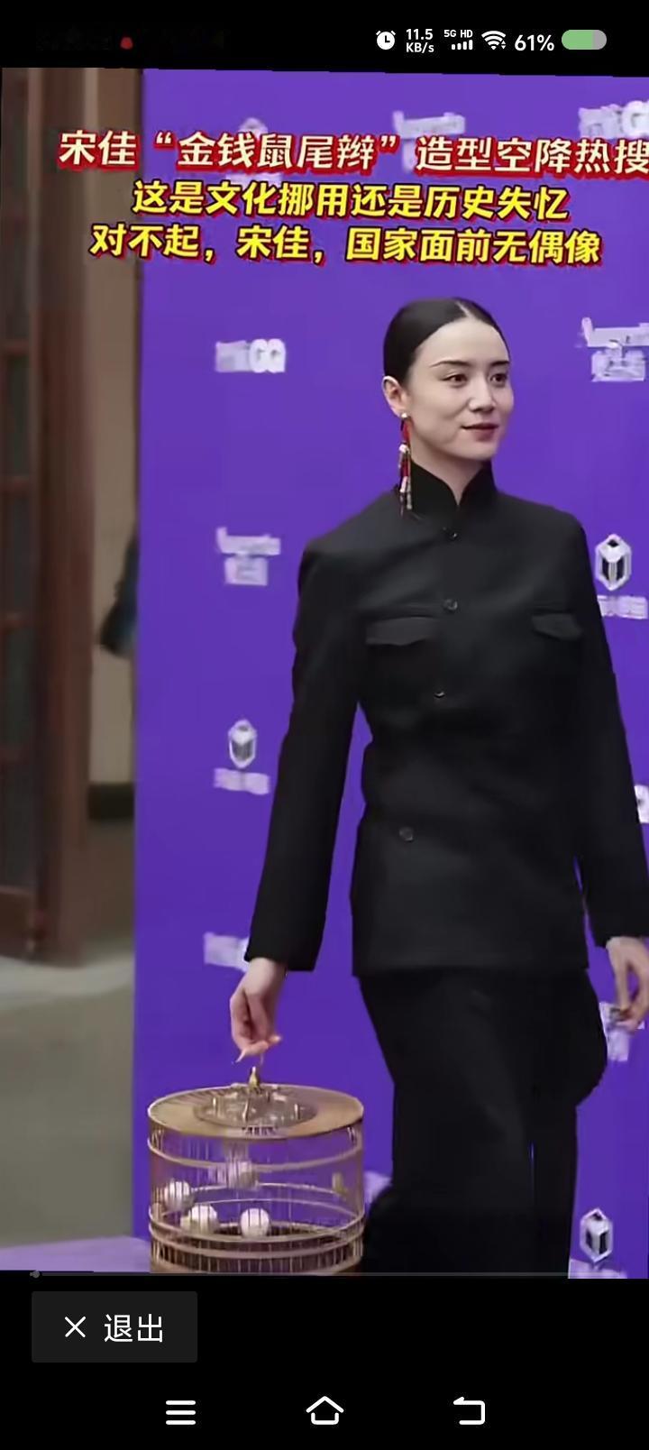 演员宋某又火了?—— 网上信息:演员宋某发饰引争议,批评者认为这有“清辫”遗风。 点评: 是不是遗风我不知道,我想知道她架只笼子什么意思,要把谁装里面?