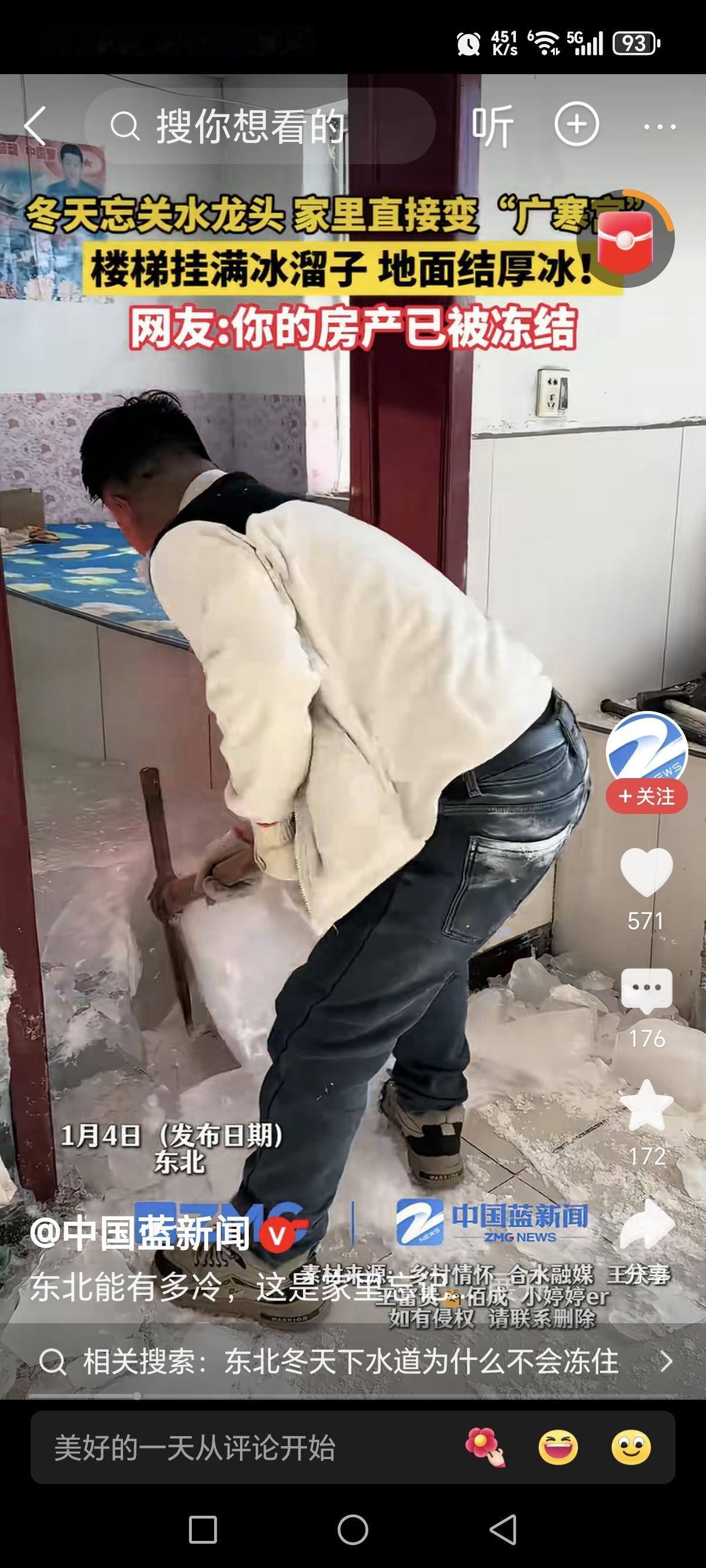 可得小心,不能马虎呀!幸亏发现及时,如果在深夜,因结冰把温度降下来一直流到卧室,冰层加厚结了上去,外围的人施救都难。门被冰封住了,推不开,可能得等来年夏天再来施救了[大笑]