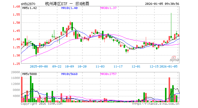 1月5日,杭州湾区ETF(512870)开盘跌0.70%,报1.416元。杭州湾区ETF(512870)重仓股方面,三花智控开盘跌1.46%,海康威视涨0.13%,同花顺涨0.25%,杭州银行涨0.00%,宁波银行涨0.32%,拓普集团跌0.69%,豪威集团涨0.37%,中微公司涨1.94%,恒生电子涨0.10%,小商品城涨0.00%。
