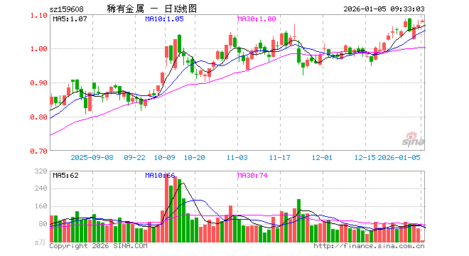 1月5日,稀有金属ETF(159608)开盘涨0.75%,报1.075元。稀有金属ETF(159608)重仓股方面,北方稀土开盘涨0.00%,洛阳钼业涨1.00%,华友钴业涨0.88%,盐湖股份涨7.46%,赣锋锂业涨1.21%,天齐锂业涨0.76%,中国稀土涨0.39%,中矿资源涨1.76%,盛和资源涨0.00%,西部超导涨2.68%。