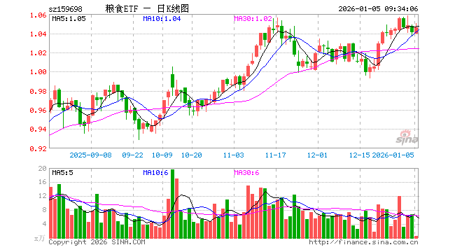 1月5日,粮食ETF(159698)开盘跌0.19%,报1.039元。粮食ETF(159698)重仓股方面,大北农开盘涨0.00%,隆平高科涨0.11%,北大荒涨0.00%,荃银高科涨0.26%,藏格矿业涨0.72%,盐湖股份涨7.46%,苏垦农发涨0.00%,亚盛集团涨0.00%,农发种业涨0.16%,云天化涨0.57%。