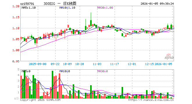 1月5日,300ESGETF(159791)开盘涨1.00%,报1.106元。300ESGETF(159791)重仓股方面,宁德时代开盘涨0.75%,贵州茅台涨0.57%,招商银行涨0.90%,中际旭创涨1.82%,长江电力涨0.04%,美的集团涨2.42%,比亚迪涨0.70%,兴业银行涨0.14%,工商银行跌0.25%,恒瑞医药涨0.82%。