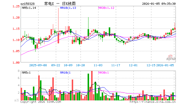 1月5日,家电ETF易方达(159328)开盘涨0.09%,报1.144元。家电ETF易方达(159328)重仓股方面,三花智控开盘跌1.46%,美的集团涨2.42%,海尔智家涨1.19%,格力电器涨0.30%,石头科技涨0.34%,麦格米特涨1.60%,四川长虹涨0.00%,科沃斯涨0.02%,海信视像涨0.45%,兆驰股份涨0.67%。