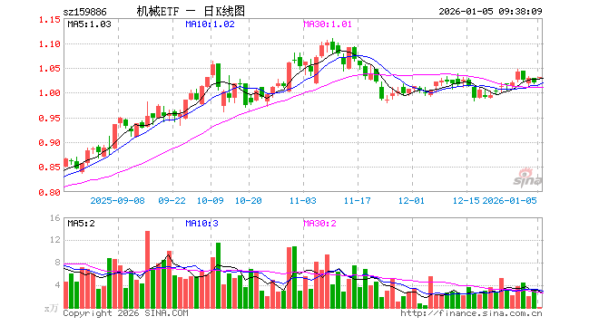 1月5日,机械ETF(159886)开盘涨0.78%,报1.028元。机械ETF(159886)重仓股方面,宁德时代开盘涨0.75%,阳光电源涨1.51%,汇川技术涨0.31%,三一重工跌0.09%,中国船舶涨0.45%,亿纬锂能涨0.05%,隆基绿能涨1.26%,徐工机械跌0.09%,江淮汽车涨0.00%,国电南瑞涨0.44%。
