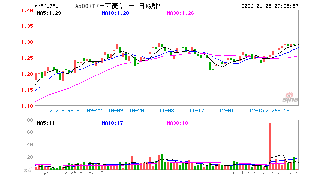 1月5日,A500ETF申万菱信(560750)开盘涨0.78%,报1.298元。A500ETF申万菱信(560750)重仓股方面,宁德时代开盘涨0.75%,贵州茅台涨0.57%,中国平安涨1.17%,招商银行涨0.90%,紫金矿业涨2.41%,新易盛涨1.42%,中际旭创涨1.82%,美的集团涨2.42%,东方财富涨0.17%,长江电力涨0.04%。