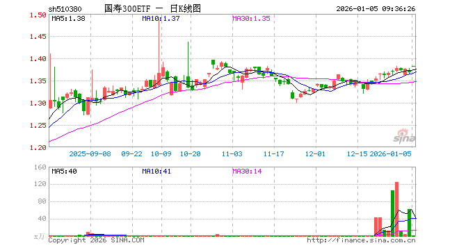 1月5日,国寿300ETF(510380)开盘涨1.02%,报1.382元。国寿300ETF(510380)重仓股方面,宁德时代开盘涨0.75%,贵州茅台涨0.57%,中国平安涨1.17%,招商银行涨0.90%,紫金矿业涨2.41%,新易盛涨1.42%,中际旭创涨1.82%,美的集团涨2.42%,东方财富涨0.17%,长江电力涨0.04%。
