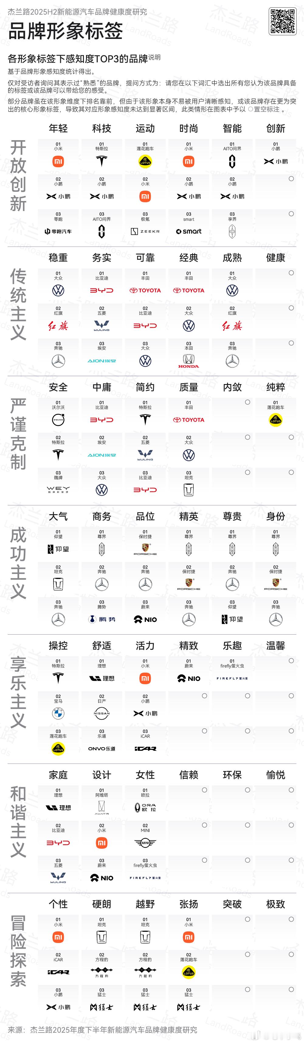 杰兰路发布的品牌研究报告,仔细研究好有意思。1、特斯拉还有很强的先发优势,但是国产品牌已经完全立起来了。2、问界的品牌已经完全立住了,百人青睐指数仅次于特斯拉排名第二,品牌档次指数高档品牌中仅次于奔驰,发展信心超过特斯拉和比亚迪成为第一。3、最有意思的是品牌标签(图四):☆没想到小鹏的品牌标签那么鲜明,跟科技创新相关的,小鹏全都名列前二,☆跟年轻时尚相关的小米全都是第一,小米确实成为了潮品。4、尊界品牌成为这一年塑造最为成功的品牌,无论是品牌青睐、品牌档次、信心,尊界都是名列前茅,对于一个今年刚刚诞生的品牌太不容易了,大嘴👍!尊界在与成功相关的6个标签中,在“商务、精英、尊贵、身份”四个形象中均位居第一,华子的品牌定位太准了。