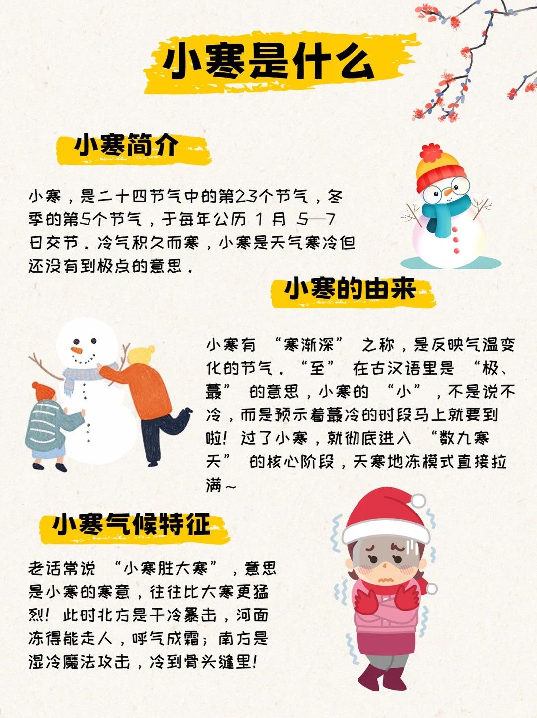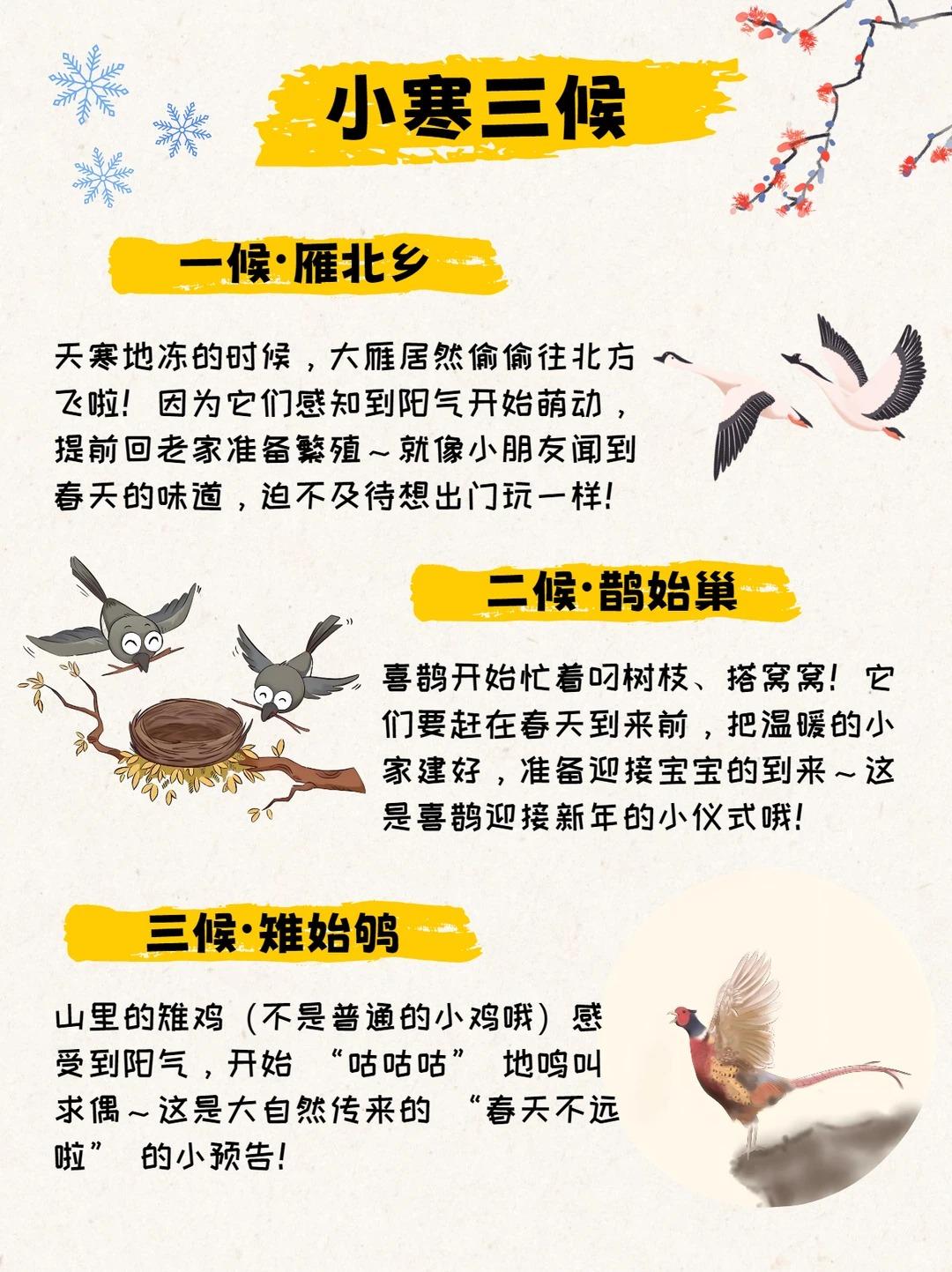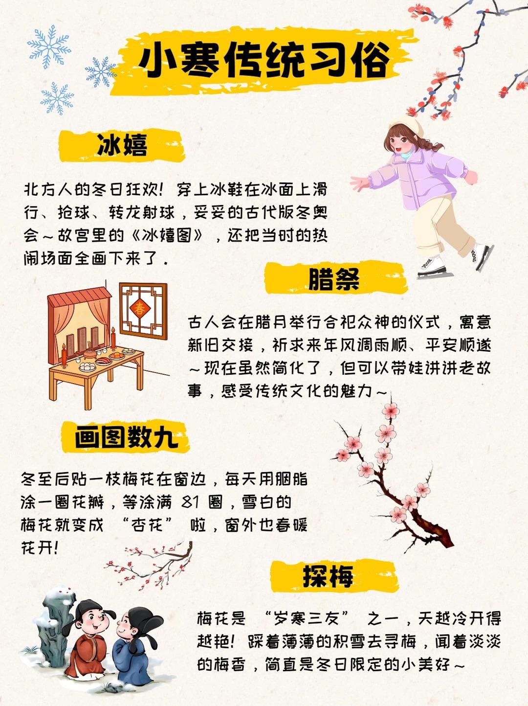 小寒习俗常识分享、小寒已至,年味渐浓 🌿 节气简介: 小寒,是二十四节气中的第23个节气,冬季的第5个节气,于每年公历 1 月 5—7 日交节。冷气积久而寒,小寒是天气寒冷但还没有到极点的意思,它与大寒、小暑、大暑及处暑一样,都是表示气温冷暖变化的节气。过了小寒,就彻底进入 “数九寒天” 的核心阶段,天寒地冻模式直接拉满~ 🐛 小寒三侯: 1️⃣ 一候雁北乡 🦢 2️⃣ 二候鹊始巢 🐦 3️⃣ 三候雉始鸲 🐔 🥢 小寒传统习俗 ⛸️冰嬉 北方人的冬日狂欢!穿上冰鞋在冰面上滑行、抢球、转龙射球,妥妥的古代版冬奥会~故宫里的《冰嬉图》,还把当时的热闹场面全画下来了,带娃看看超有趣! 🧨 腊祭 古人会在腊月举行合祀众神的仪式,寓意新旧交接,祈求来年风调雨顺、平安顺遂~现在虽然简化了,但可以带娃讲讲老故事,感受传统文化的魅力~ 🎨画图数九 冬至后贴一枝梅花在窗边,每天用胭脂涂一圈花瓣,等涂满 81 圈,雪白的梅花就变成 “杏花” 啦,窗外也春暖花开! 🌸探梅 梅花是 “岁寒三友” 之一,天越冷开得越艳!踩着薄薄的积雪去寻梅,闻着淡淡的梅香,简直是冬日限定的小美好~ 🍵围炉煮茶 一家人围坐在暖乎乎的炉火旁,煮一壶热茶,嗑着瓜子唠唠嗑,不仅驱散了寒意,也增进了家庭成员之间的感情。 🥣喝腊八粥 腊八节,中国北方地区节日習俗是喝腊八粥,用黄米、白米、栗子、红枣、花生等食材熬煮,香甜软糯,喝一碗从头暖到脚! 🥬吃黄芽.菜 天津人的小寒标配!用白菜芽做成,脆嫩清甜,咬一口咯吱咯吱~老辈人说吃了黄芽.菜,冬天不怕冷! 🍚吃南京菜饭 老南京人的小寒必吃,用矮脚黄青菜与咸肉片、香肠片或是板鸭丁,再剁上一些生姜粒与糯米一起煮,做成香鲜可口的"南京菜饭"。