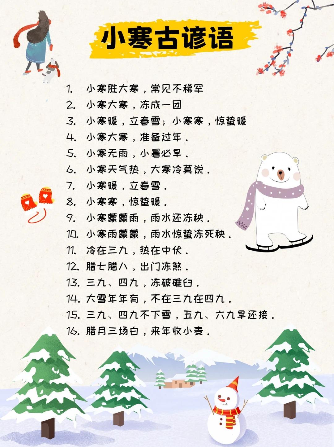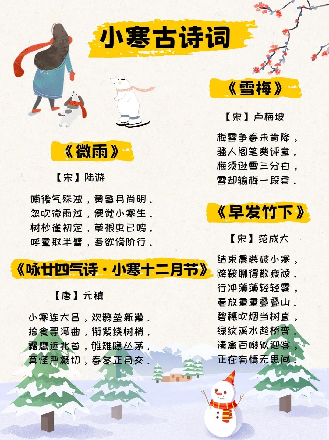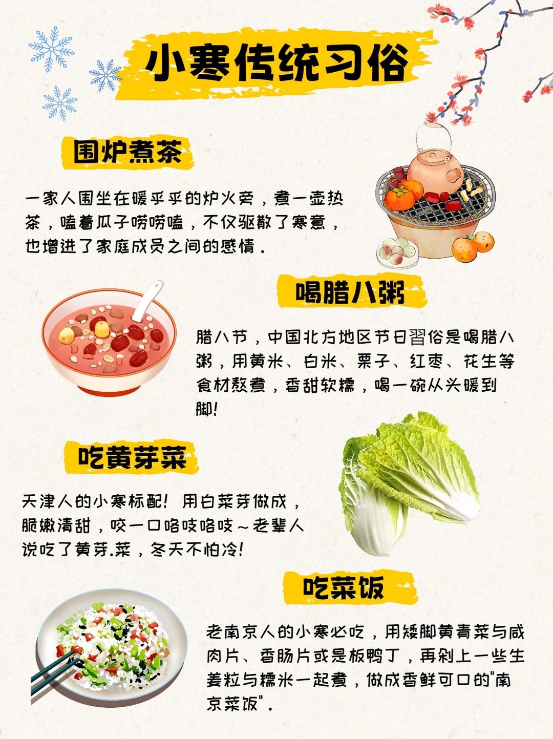 小寒习俗常识分享、小寒已至,年味渐浓 🌿 节气简介: 小寒,是二十四节气中的第23个节气,冬季的第5个节气,于每年公历 1 月 5—7 日交节。冷气积久而寒,小寒是天气寒冷但还没有到极点的意思,它与大寒、小暑、大暑及处暑一样,都是表示气温冷暖变化的节气。过了小寒,就彻底进入 “数九寒天” 的核心阶段,天寒地冻模式直接拉满~ 🐛 小寒三侯: 1️⃣ 一候雁北乡 🦢 2️⃣ 二候鹊始巢 🐦 3️⃣ 三候雉始鸲 🐔 🥢 小寒传统习俗 ⛸️冰嬉 北方人的冬日狂欢!穿上冰鞋在冰面上滑行、抢球、转龙射球,妥妥的古代版冬奥会~故宫里的《冰嬉图》,还把当时的热闹场面全画下来了,带娃看看超有趣! 🧨 腊祭 古人会在腊月举行合祀众神的仪式,寓意新旧交接,祈求来年风调雨顺、平安顺遂~现在虽然简化了,但可以带娃讲讲老故事,感受传统文化的魅力~ 🎨画图数九 冬至后贴一枝梅花在窗边,每天用胭脂涂一圈花瓣,等涂满 81 圈,雪白的梅花就变成 “杏花” 啦,窗外也春暖花开! 🌸探梅 梅花是 “岁寒三友” 之一,天越冷开得越艳!踩着薄薄的积雪去寻梅,闻着淡淡的梅香,简直是冬日限定的小美好~ 🍵围炉煮茶 一家人围坐在暖乎乎的炉火旁,煮一壶热茶,嗑着瓜子唠唠嗑,不仅驱散了寒意,也增进了家庭成员之间的感情。 🥣喝腊八粥 腊八节,中国北方地区节日習俗是喝腊八粥,用黄米、白米、栗子、红枣、花生等食材熬煮,香甜软糯,喝一碗从头暖到脚! 🥬吃黄芽.菜 天津人的小寒标配!用白菜芽做成,脆嫩清甜,咬一口咯吱咯吱~老辈人说吃了黄芽.菜,冬天不怕冷! 🍚吃南京菜饭 老南京人的小寒必吃,用矮脚黄青菜与咸肉片、香肠片或是板鸭丁,再剁上一些生姜粒与糯米一起煮,做成香鲜可口的"南京菜饭"。